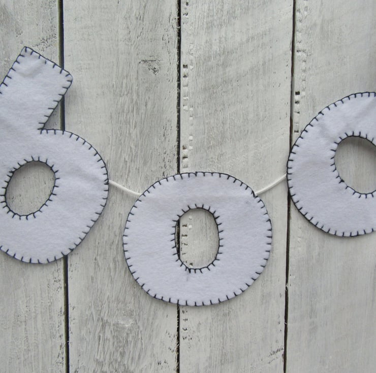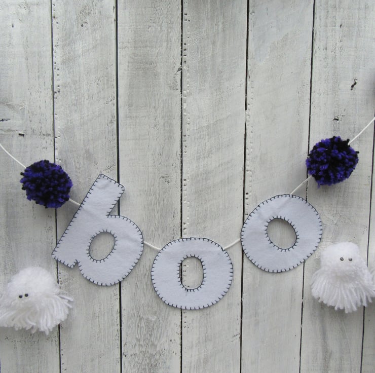 The letters BOO in hardened white acrylic felt with hand stitched with black thread form the words at the center of the garland.
