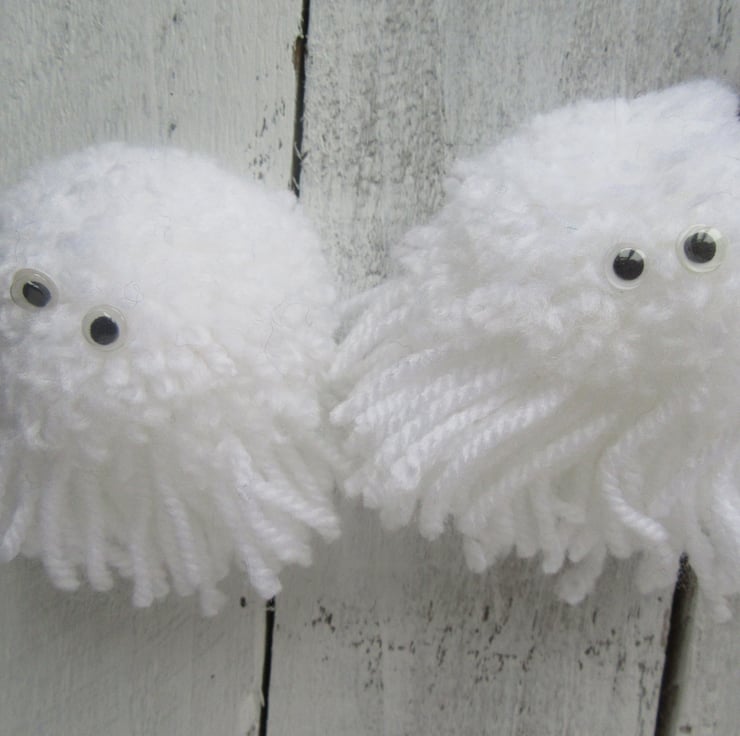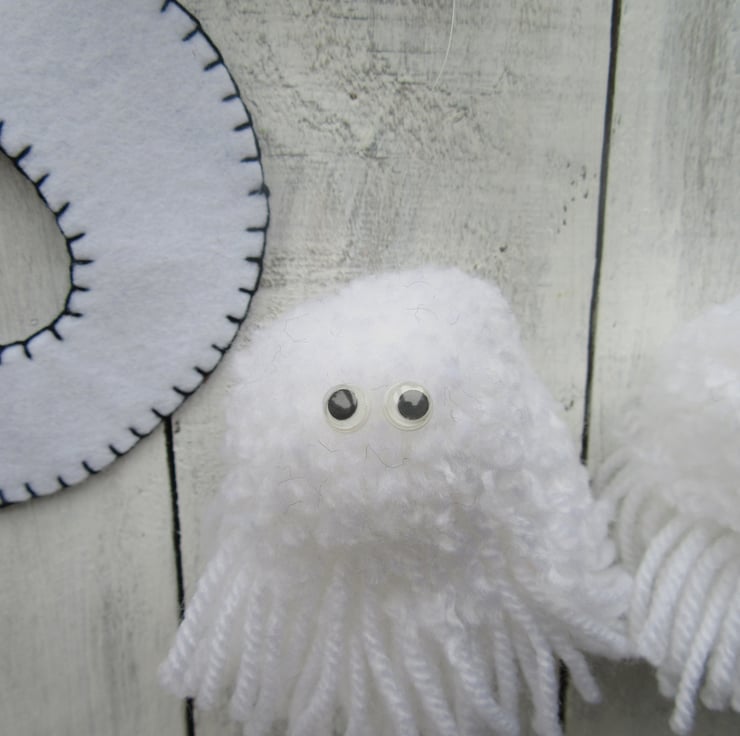 This cute Halloween bunting contains four white pompom ghosts, with googly eyes, connected to a strong white cord by ‘invisible’ thread.