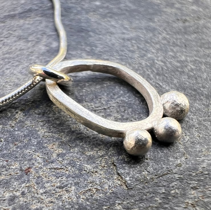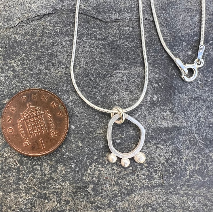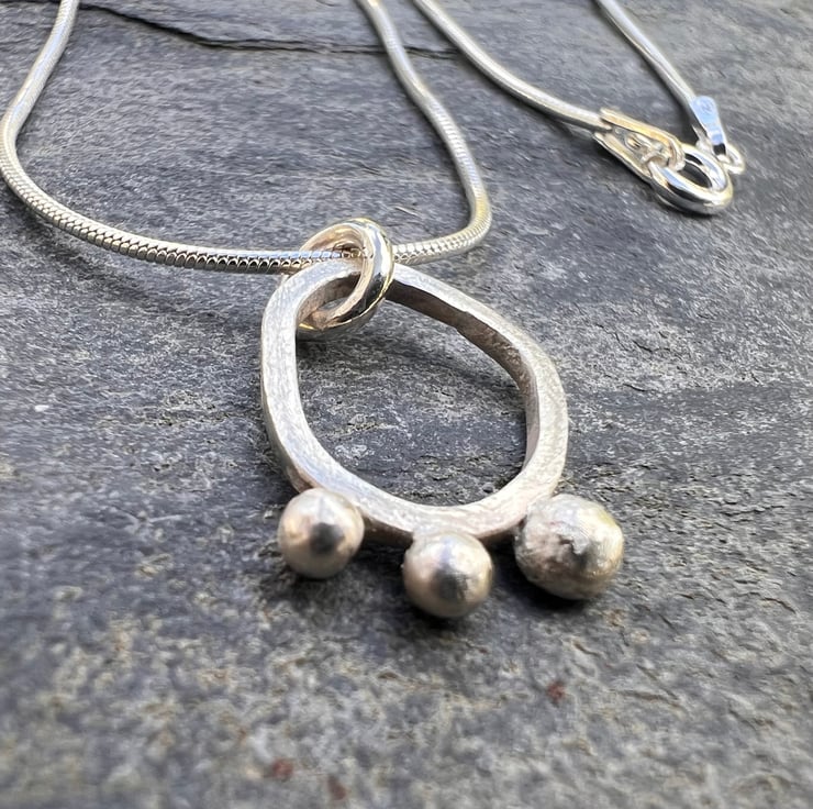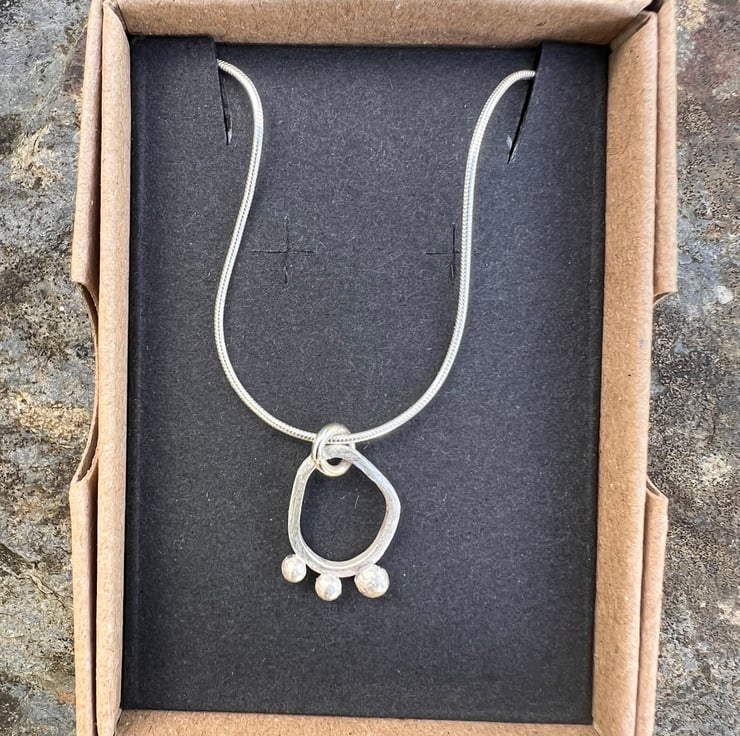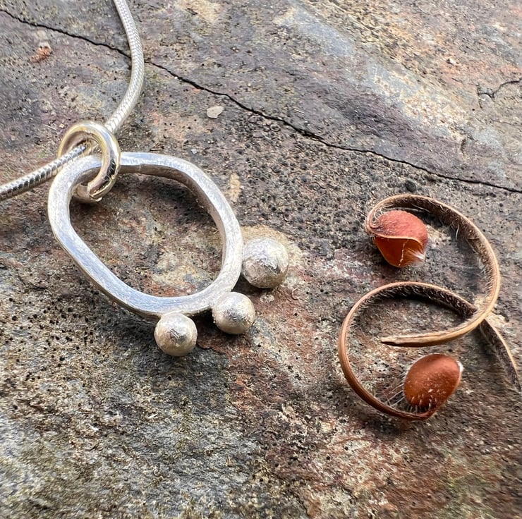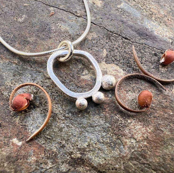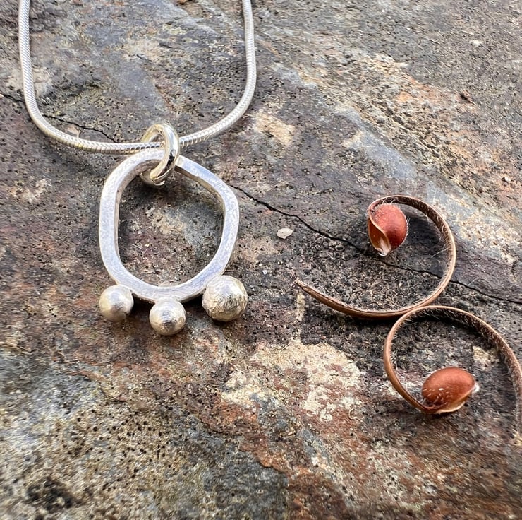 A simple, elegant , contemporary silver necklace made from sterling eco silver square wire, soldered together into an organic seed pod shape. 3 silver seeds are still clinging on to the edge of the pod; made from left over bits of silver. The surface of the silver has a matt/frosted surface .