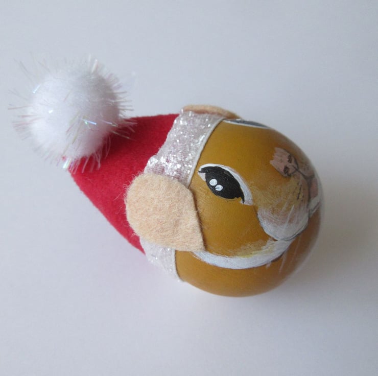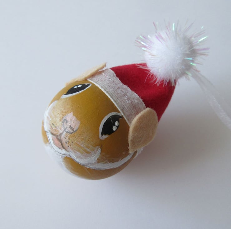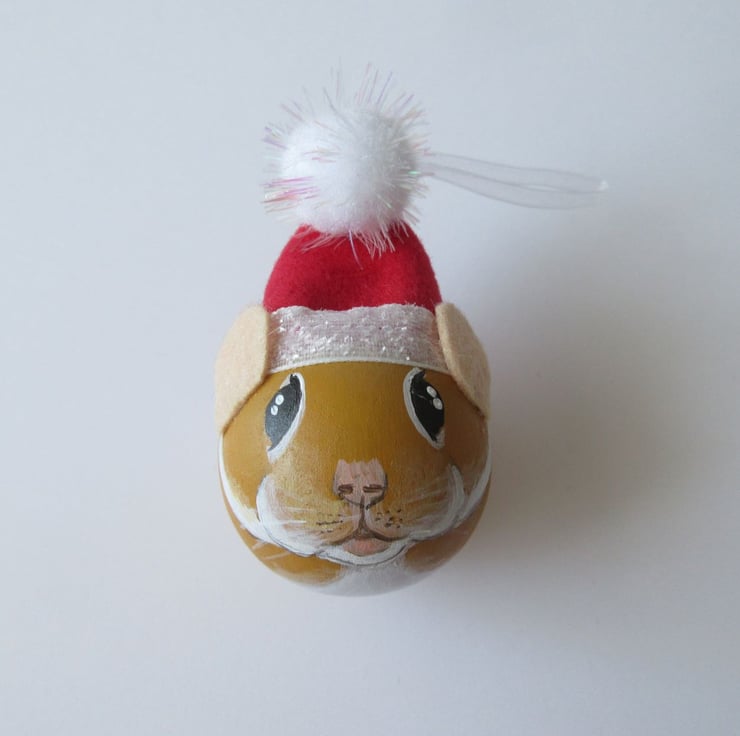 The hamster is wearing a hand made Santa hat, with a ribbon loop so that it can easily hung.