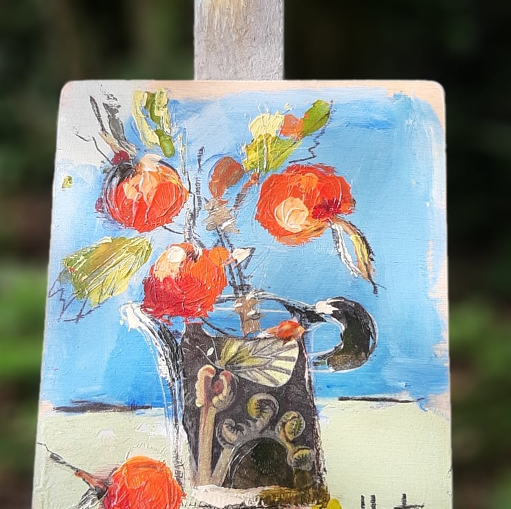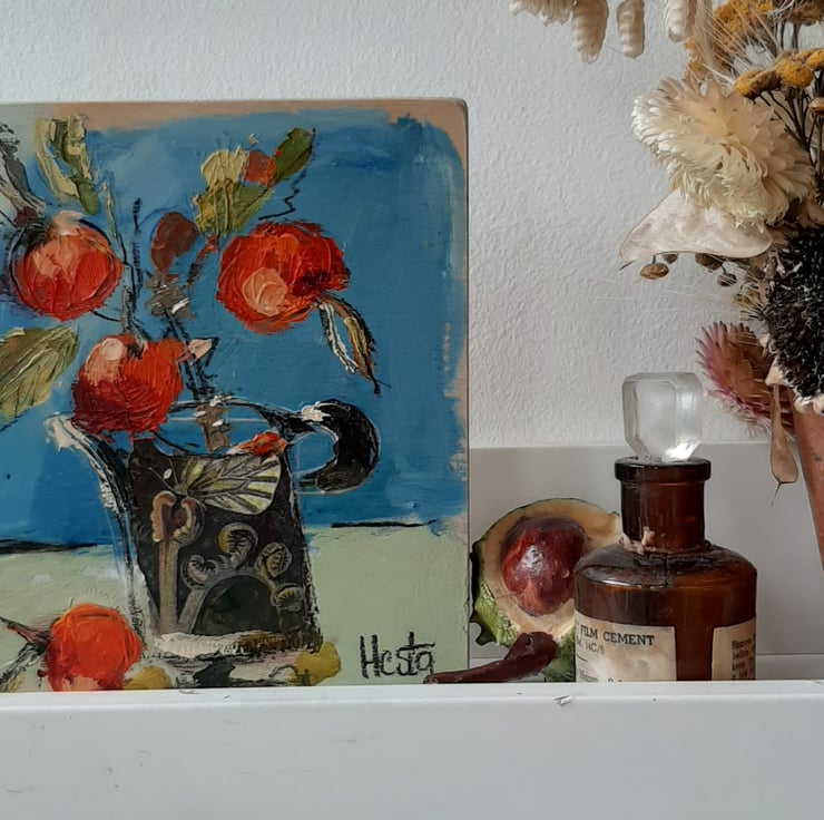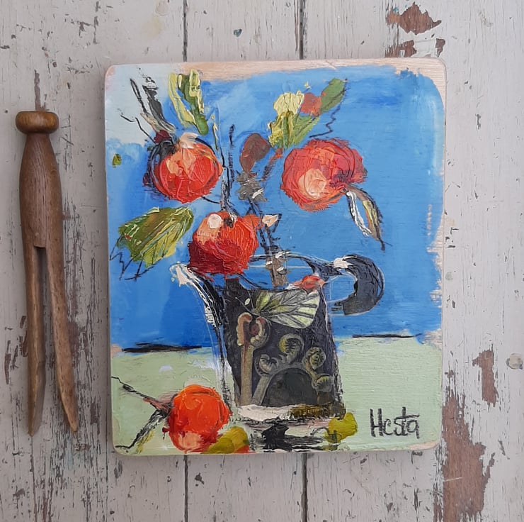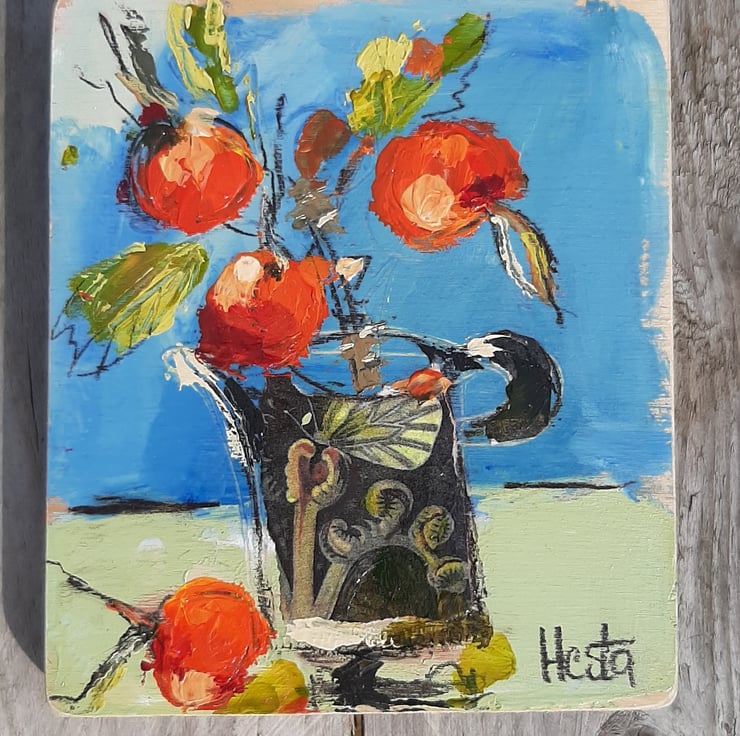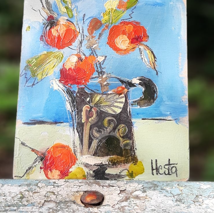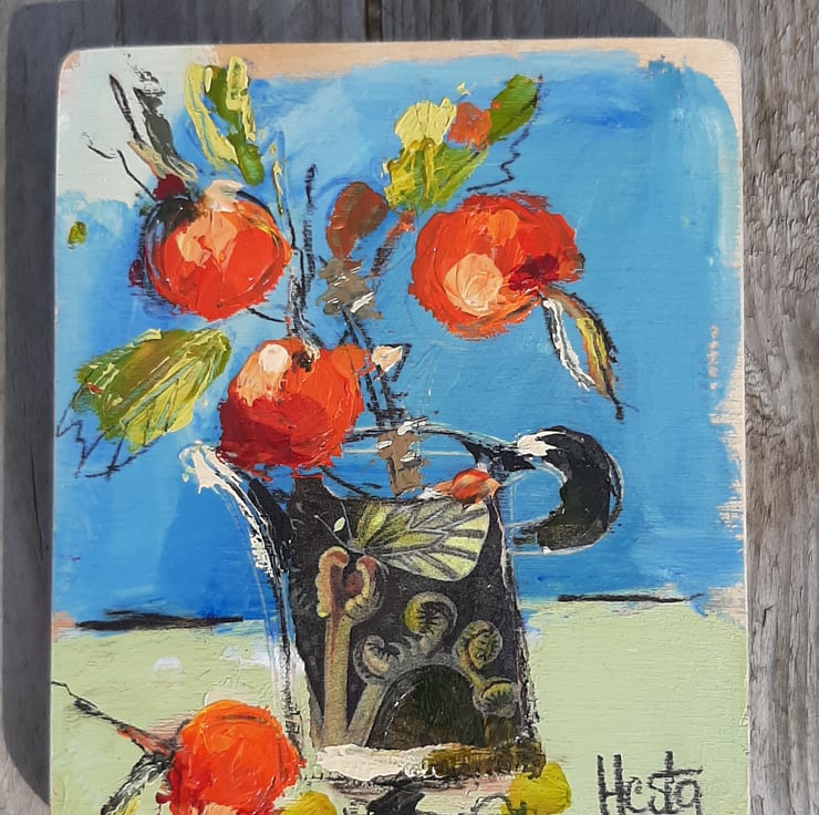This bright autumnal painting is rich in colour and texture. Painted on thick reclaimed wood. Added texture with the clever use of collage. Measuring 12 cm wide 14 cm tall. 2 cm deep. It pops of autumn joy. By artist hesta singlewood aka bodkincreates on Instagram. It has been lightly varnished and signed . All ready to hang .
