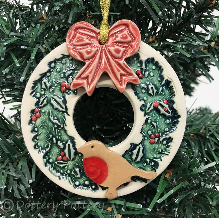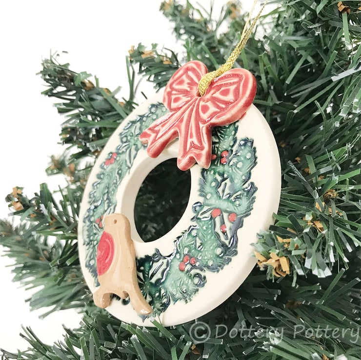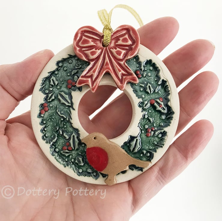 This pottery robin Christmas decoration is made from white earthenware clay and imprinted with a holly wreath. It has been left as the plain cream coloured clay on the outside and the wreath has been glazed in a rich green glaze with little red holly berry accents. It has been fired twice. It measures 7.5cm diameter and hangs from a gold ribbon. Decorated on the front only.