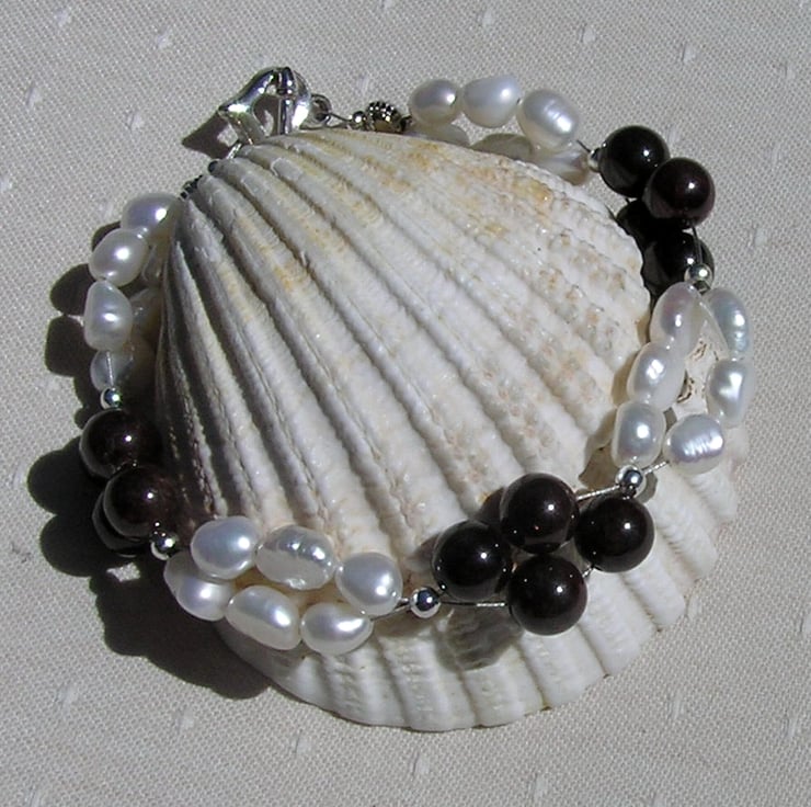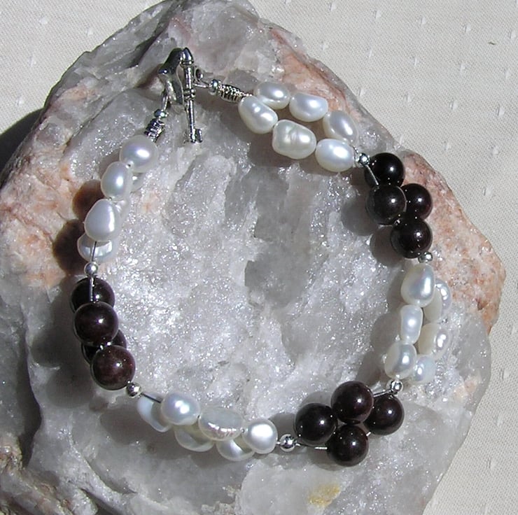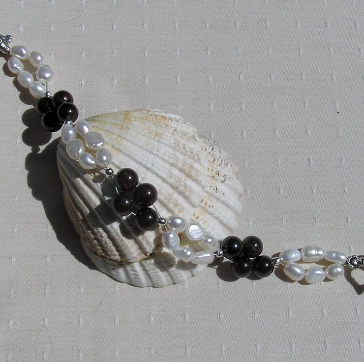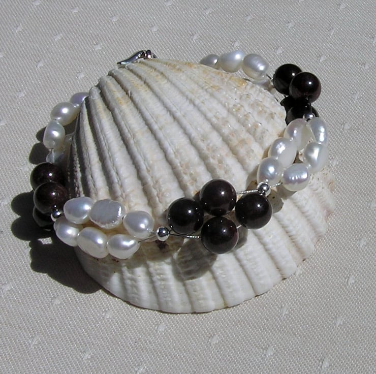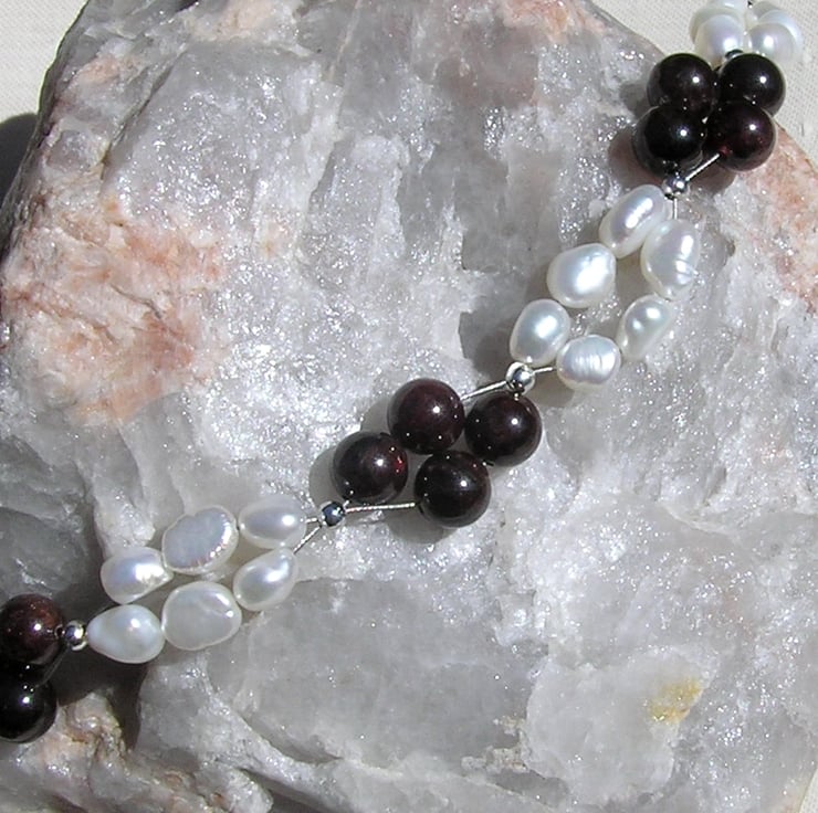 This Stunning Bracelet is made from alternating groups of Red Garnet and double-stranded White Freshwater Pearl Beads, each section separated by a tiny Silver spacer - a Beautiful regal combination that will look stunning either worn casually or with something more Elegant for a Special Evening out