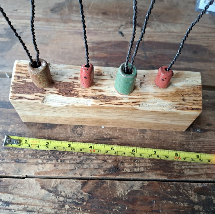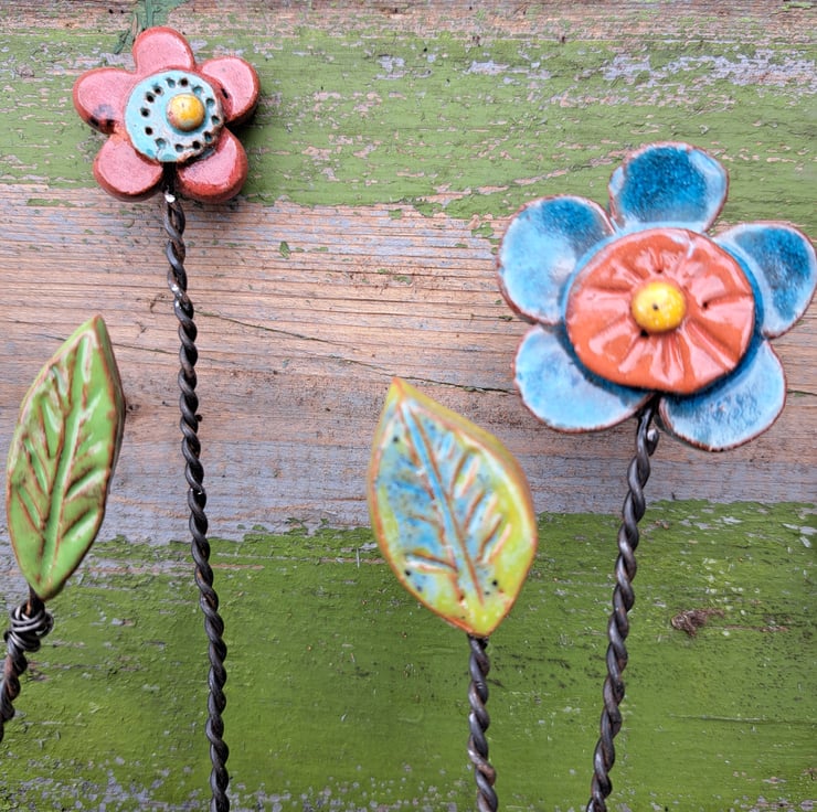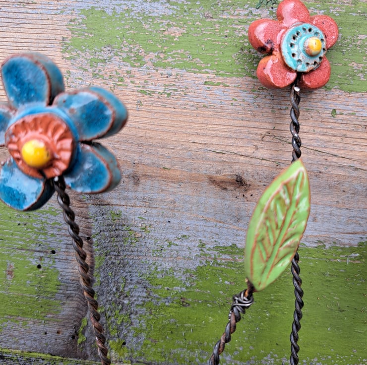 I make each pottery flower before attaching each one using discarded fence wire.