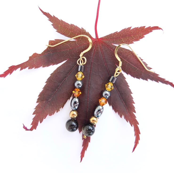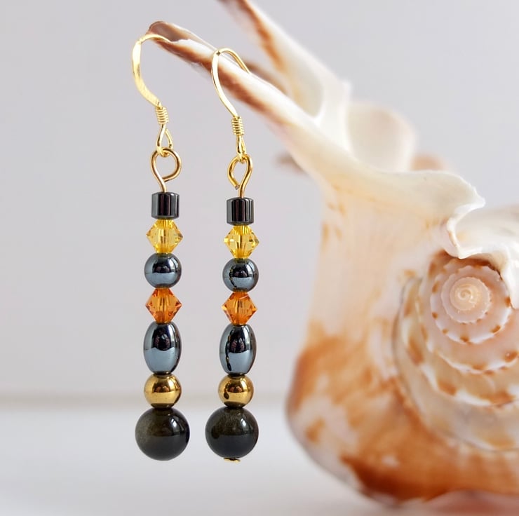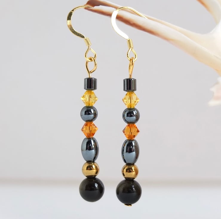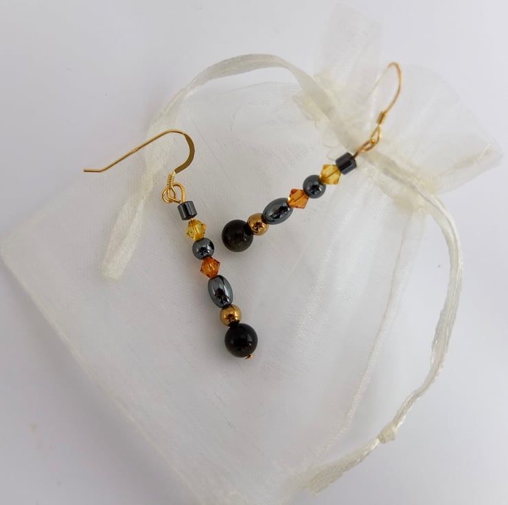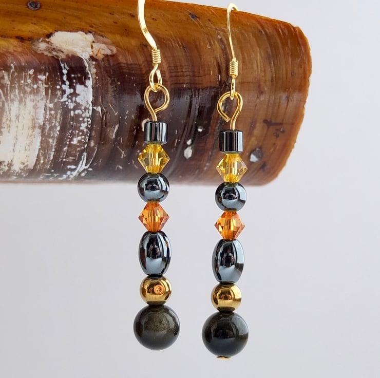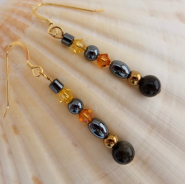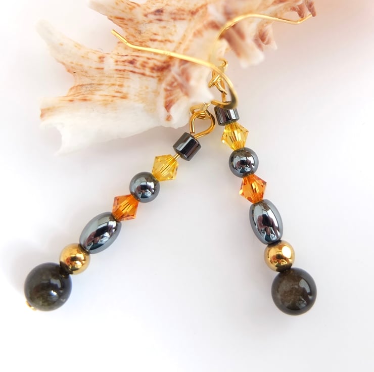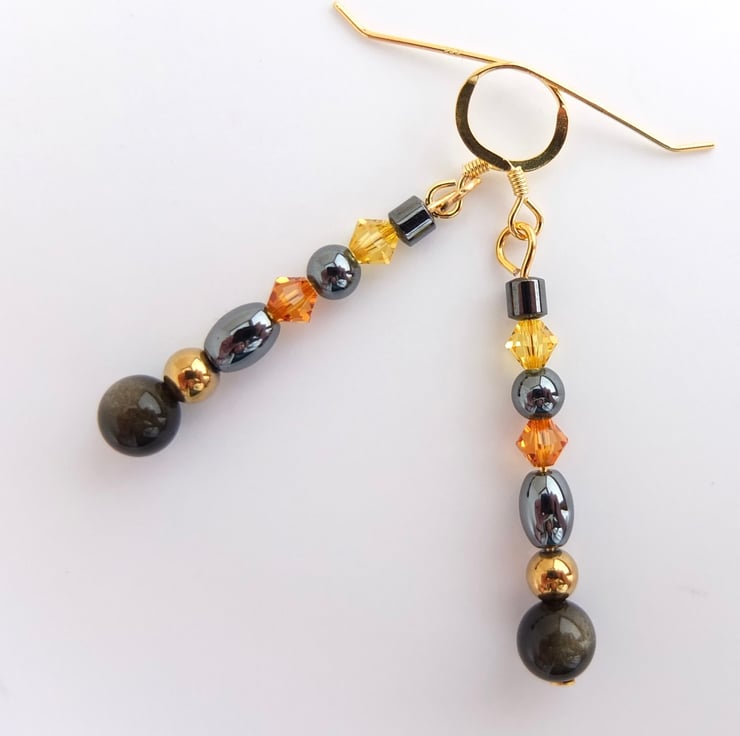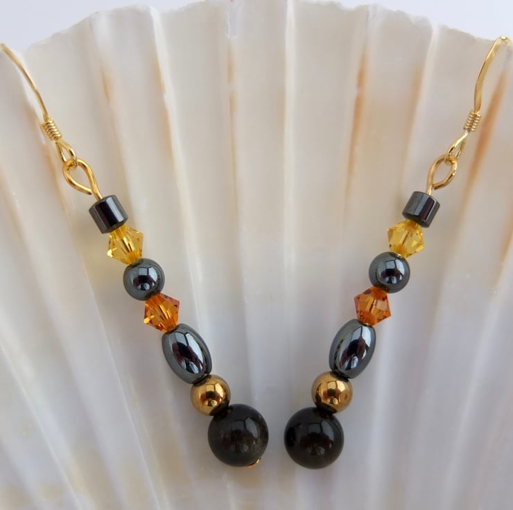 Each earring, from base to top, is made from beads of 6mm gold-sheen obsidian, 4mm golden hematite, 5mm oval hematite, Swarovski crystal in the colour "topaz", 4mm hematite, Swarovski crystal in the colours "light topaz" and 3mm hematite barrel.