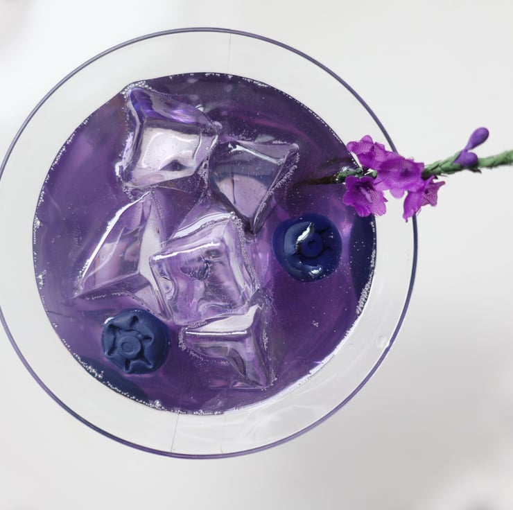One life sized fake cocktail Blueberry Lavender Martini. Comes in a polycarbonate glass filled with ice cubes, blueberries and a sprig of lavender flower.