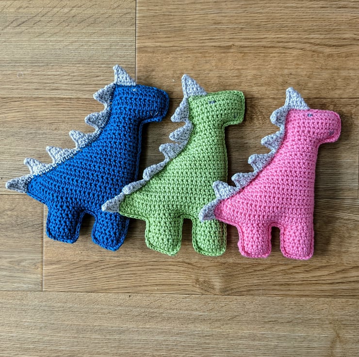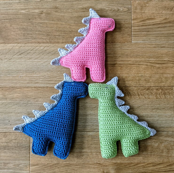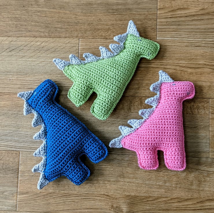 This 'ragdoll' style crochet toy is made in two pieces that are crocheted together, so that there is no chance of losing a leg! The spines are crocheted onto the completed body in one piece so they are very securely attached. As with all my toys, this dinosaur has been designed to be safe for babies and young children to play with and meets the requirements of the Toy (Safety) Regulations 2011, displaying the new UKCA mark on its label.