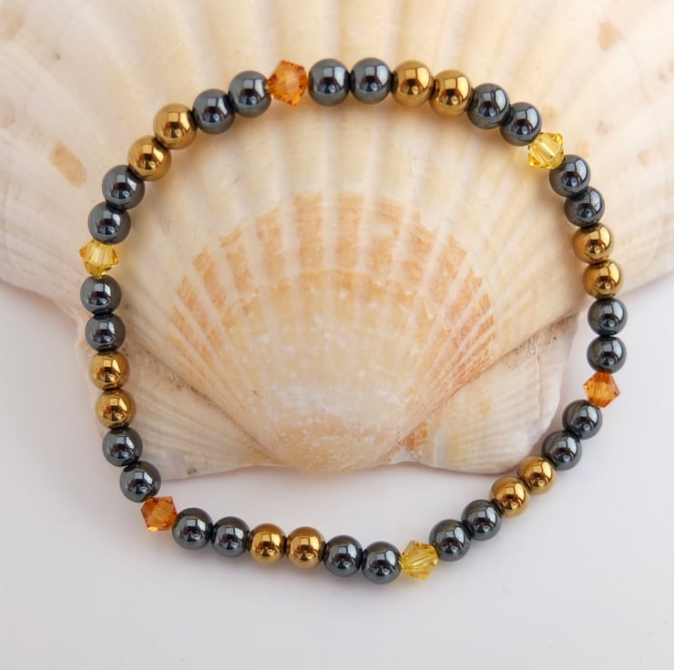 Golden and gunmetal-black 4mm round hematite beads are punctuated with Swarovski crystals in the colours "topaz" and "light topaz".
