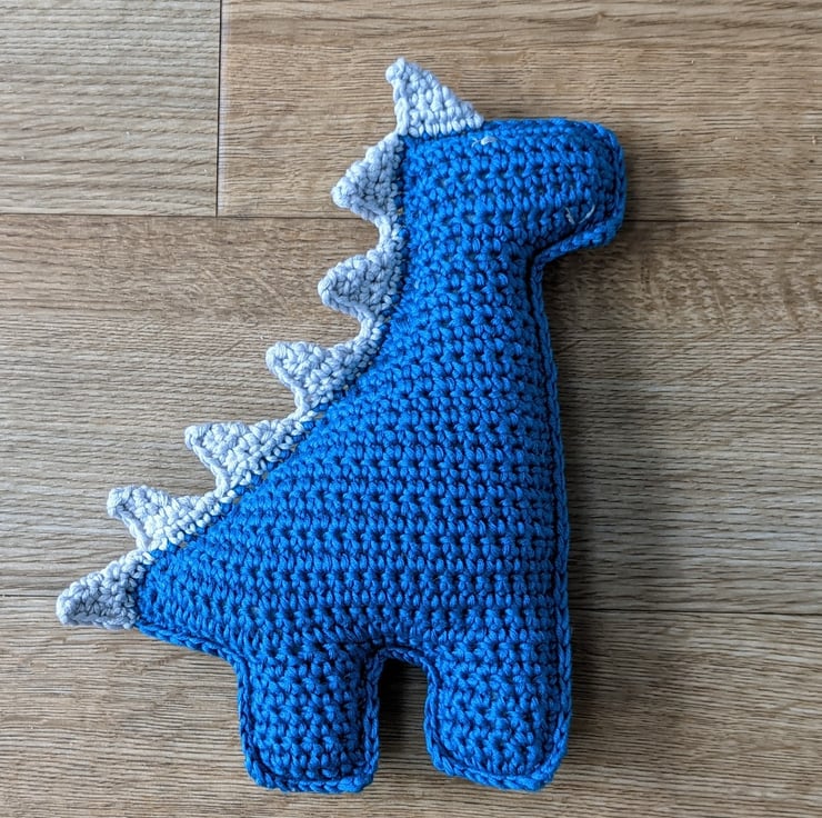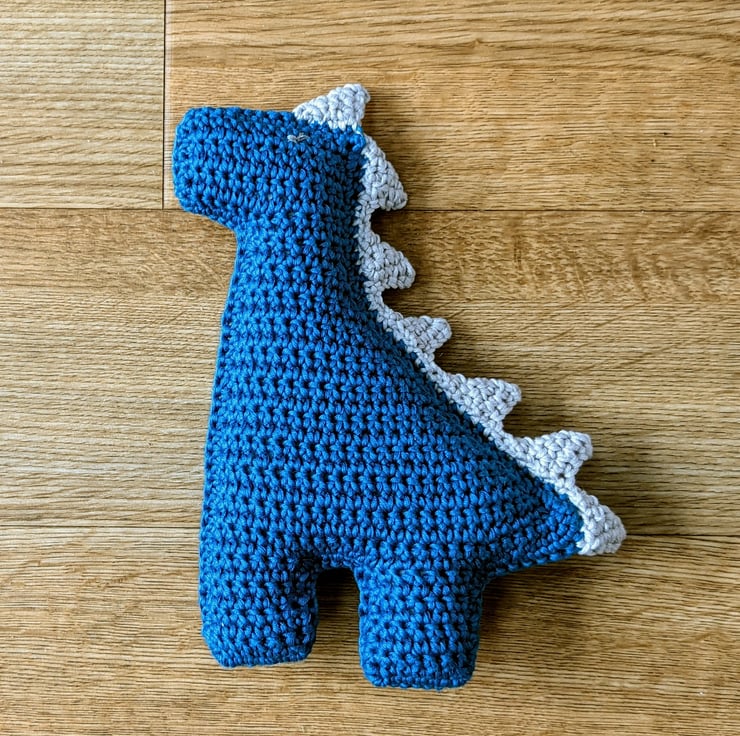 This 'ragdoll' style crochet toy is made in two pieces that are crocheted together, so that there is no chance of losing a leg! The spines are crocheted onto the completed body in one piece so they are very securely attached. As with all my toys, this dinosaur has been designed to be safe for babies and young children to play with and meets the requirements of the Toy (Safety) Regulations 2011, displaying the new UKCA mark on its label.