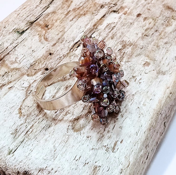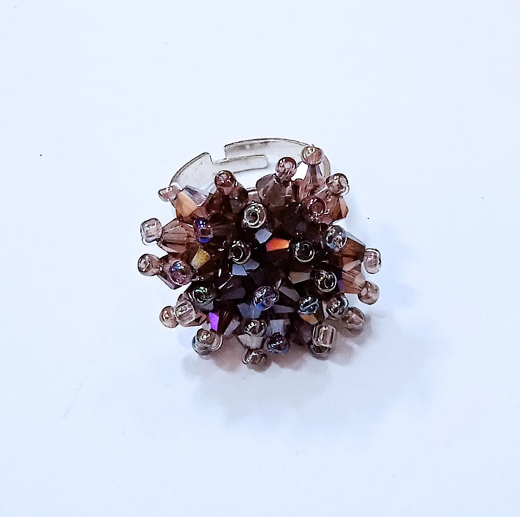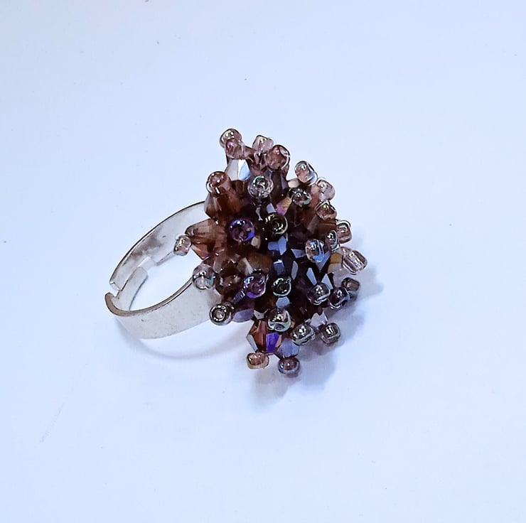 This ring is hand made from 4 mm purple crystal bicone beads which are individually strung onto a silver plated ring which is adjustable to fit most ring sizes.