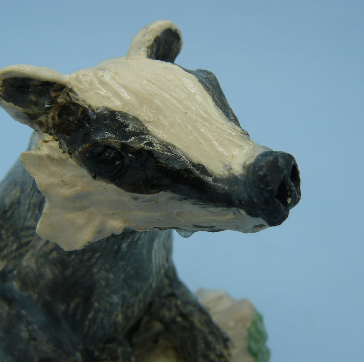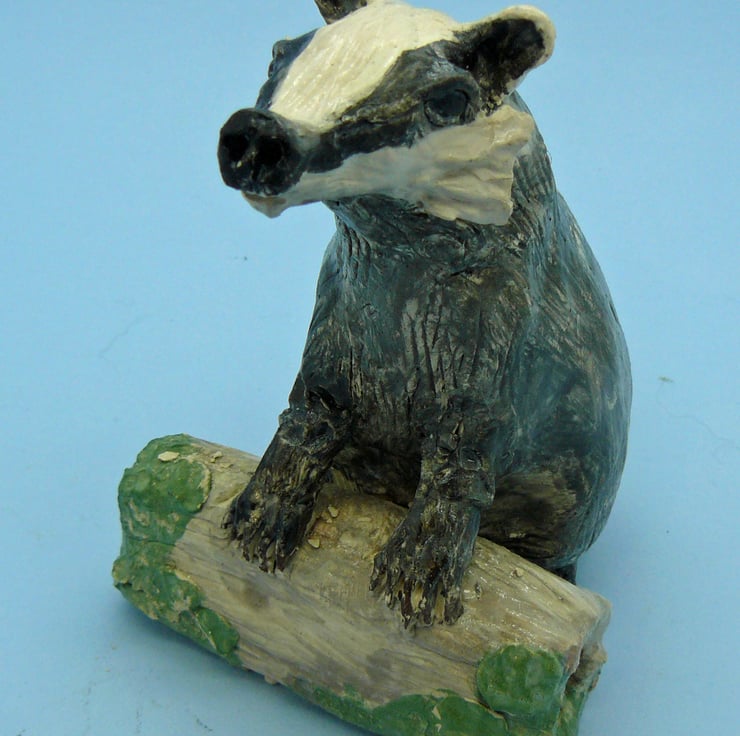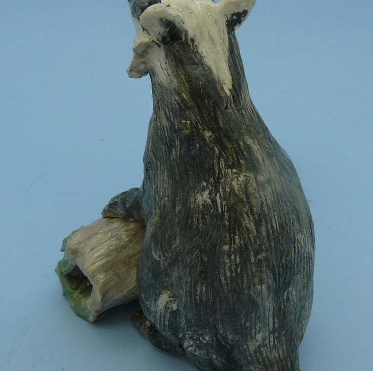 Clay Badger on log that has been painted with coloured slips & underglazes & is 13 x 10 x 10 cms. Made by the pinched pot method.