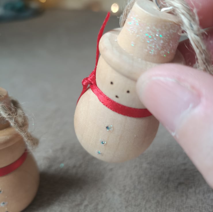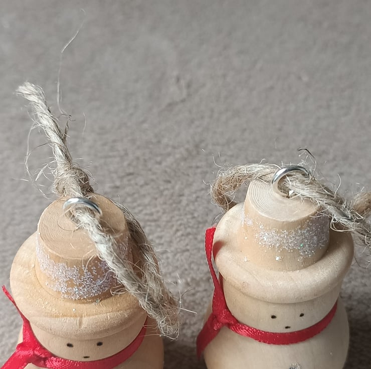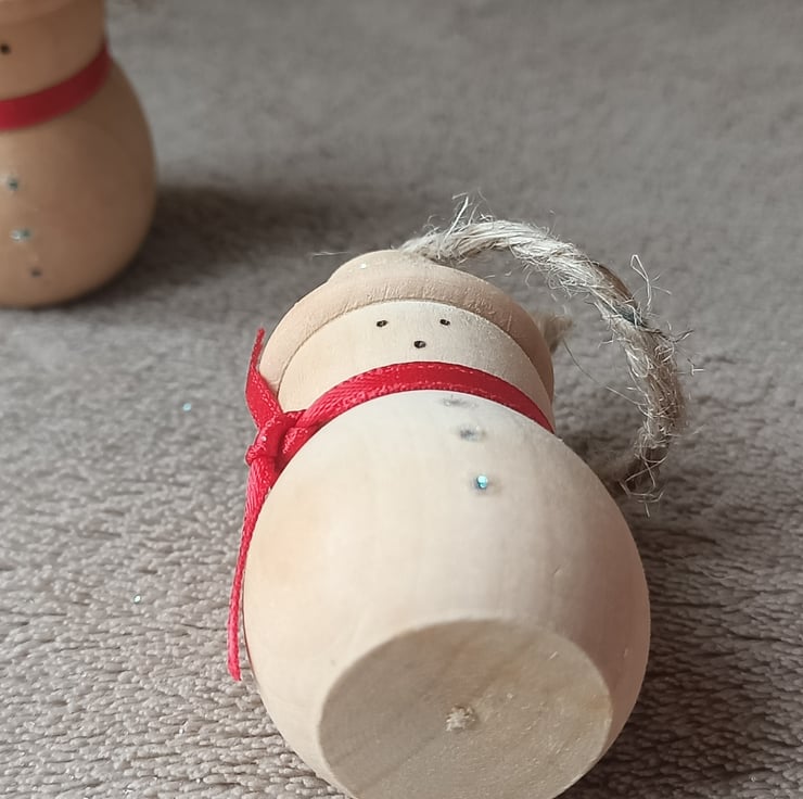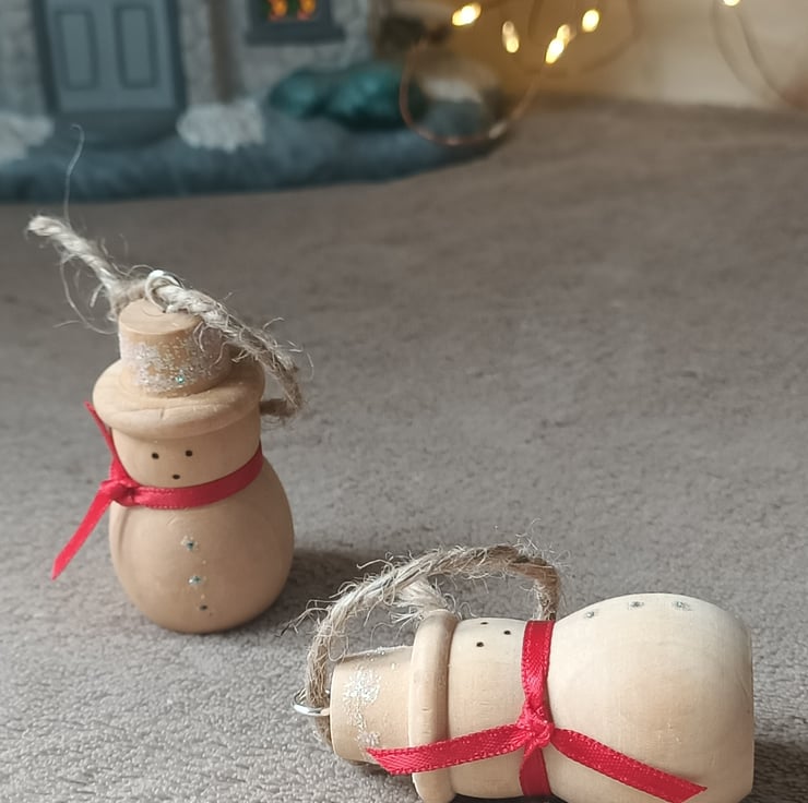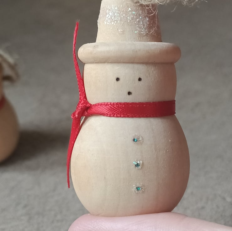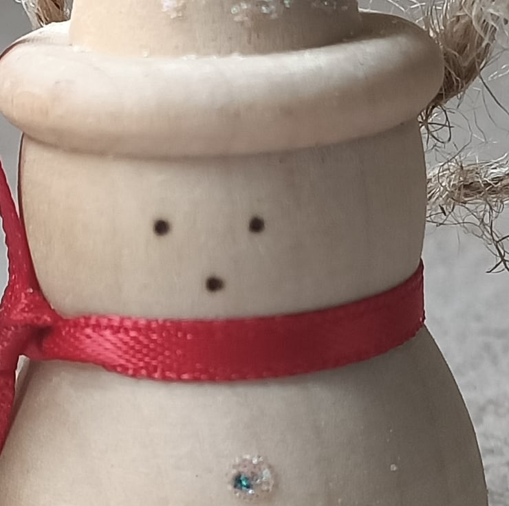 snowman wood turned traditional christmas tree decoration. This cute little snowman has been turned from a solid piece of wood. He has a very natural wooden traditional feel to him. We have put a simple cherry red satin ribbon around his neck and hand pyrographed a cute little face. His buttons and hat have had some snowy sparkle attached for added glamour. A silver coloured metal hook attaches to his hat where a hessian string allows for hanging.