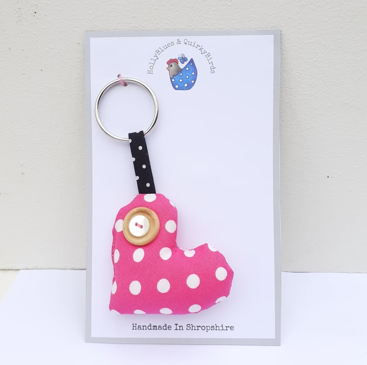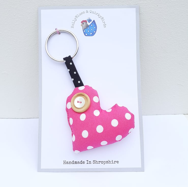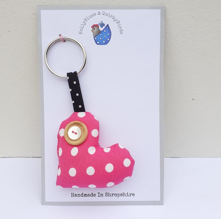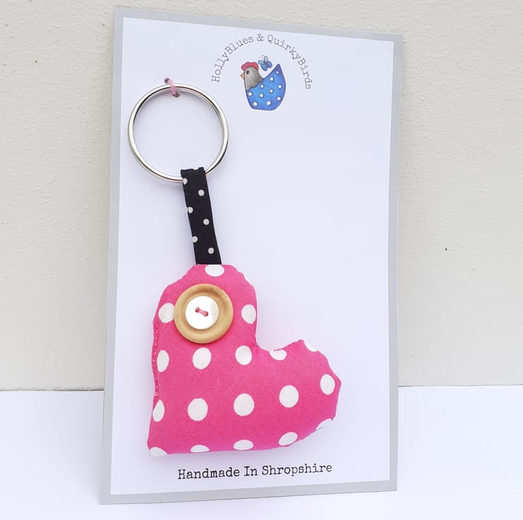 Each heart is hand cut from carefully chosen spotty fabrics, I then add a loop made from contrasting fabric and cute wooded and mother of pearl buttons.