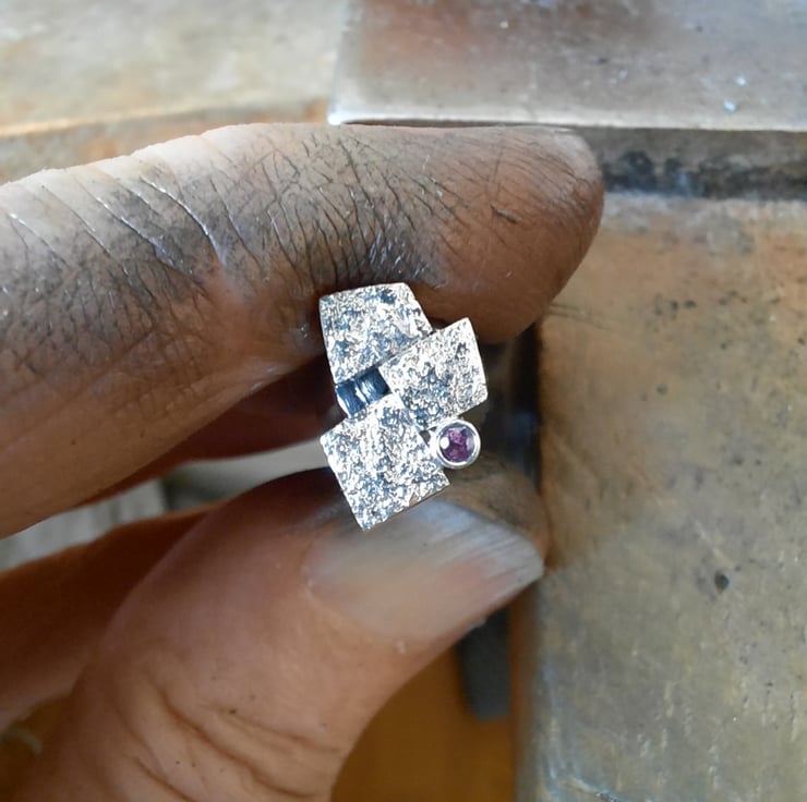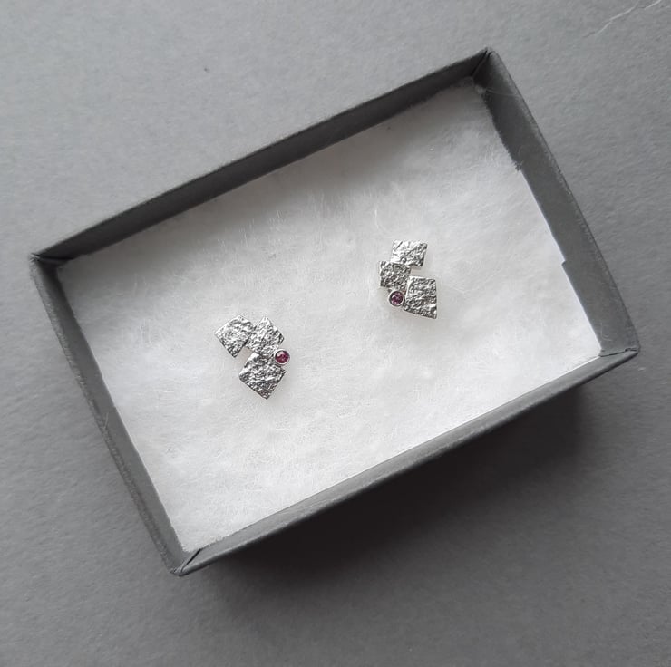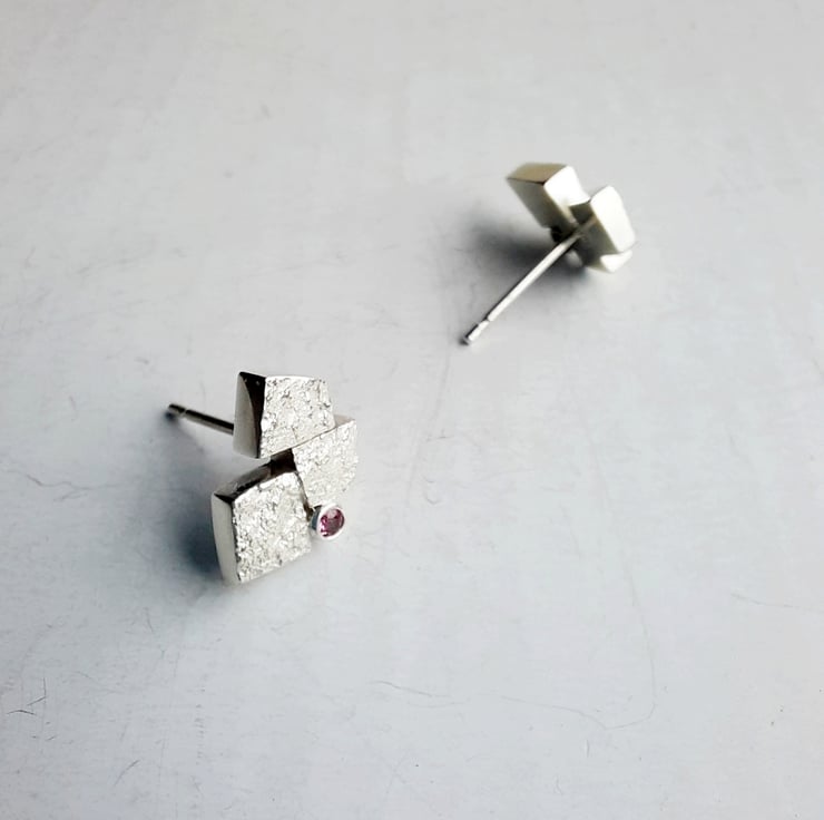 Each pair is carefully sawn and textured by hand, then filed, soldered and sanded, and finally burnished to a sparkly finish. To add a little glint to their sparkle, this pair is set with the tiniest 1.75mm pink sapphires. However, catch them in the right light and their pink is really vibrant.