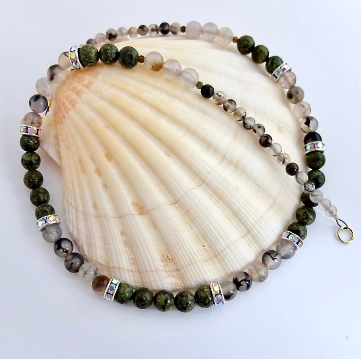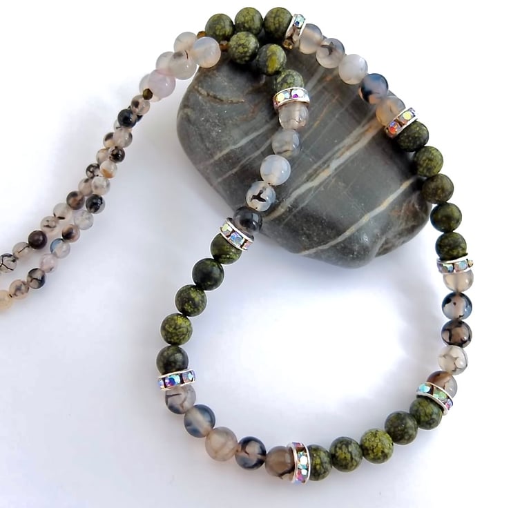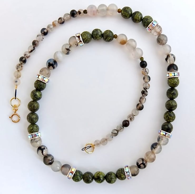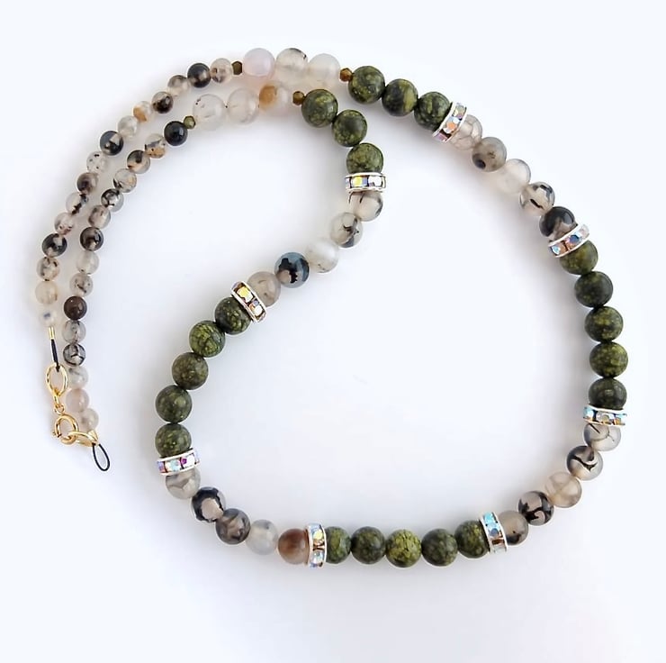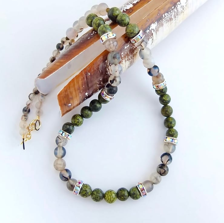 These mottled green lace jasper beads were so reminiscent of serpent skin, that I just had to pair them with dragon vein agate.