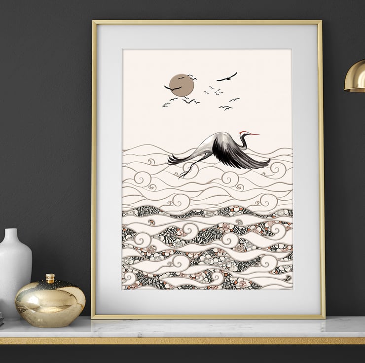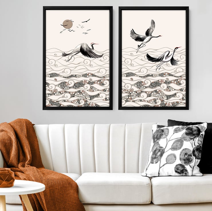 "Decorate your living room with this set of 2 Cranes art prints with Japanese inspiration. Add some style to your home decor, ideal for Minimalistic homes, Bohemian houses, or as a house-warming gift. It can be used as a Living room art wall. As house entry wall as well as a bedroom artwork.