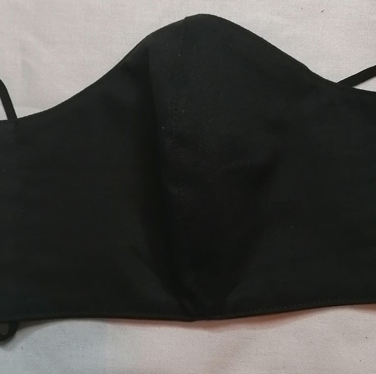 Hand made 100% cotton triple layer face mask. Reusable and washable with a nose wire that can be removed prior to washing. This is made with 3 layers of plain black cotton.