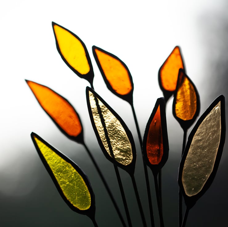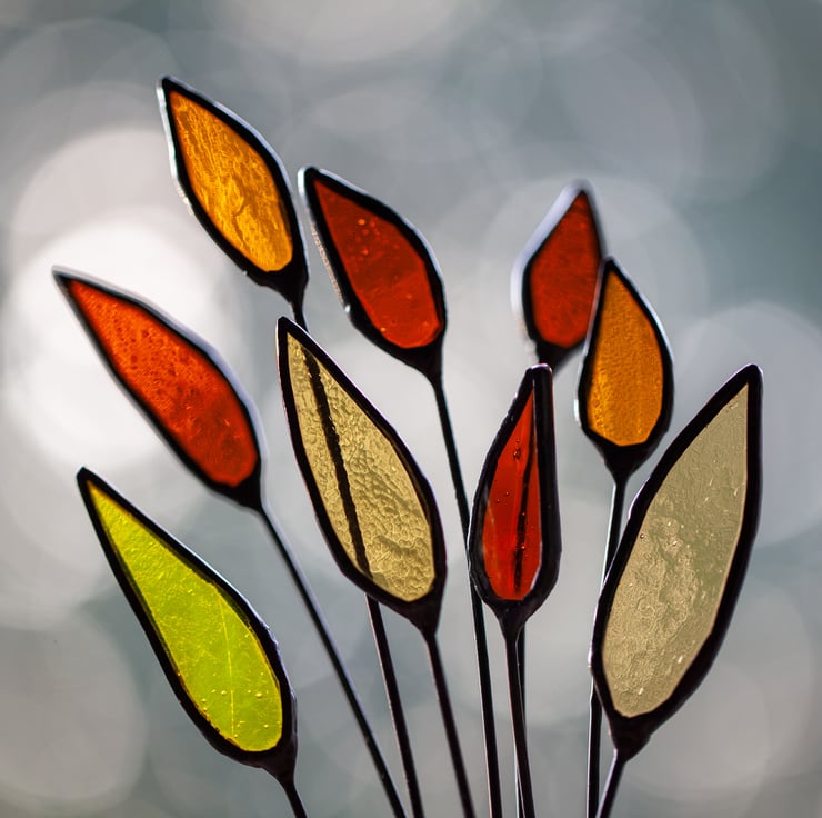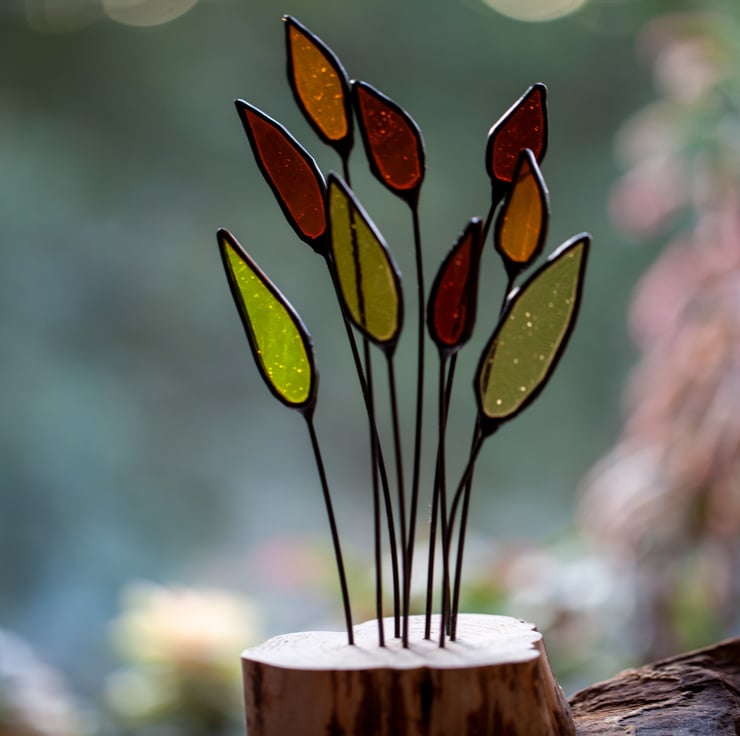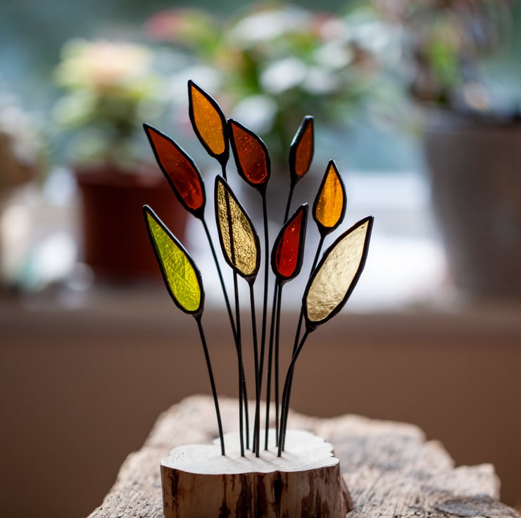 Bunch of stained glass flowers made to add some colour to your home. It looks great on window sill or shelf. Flowers are set in waxed slice of wood.