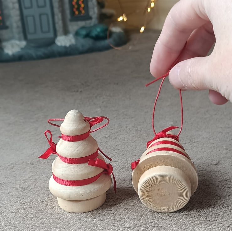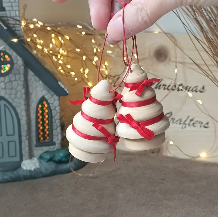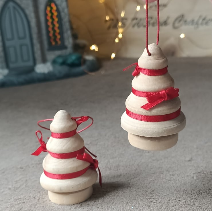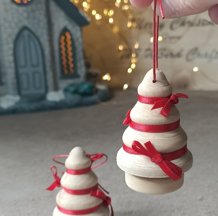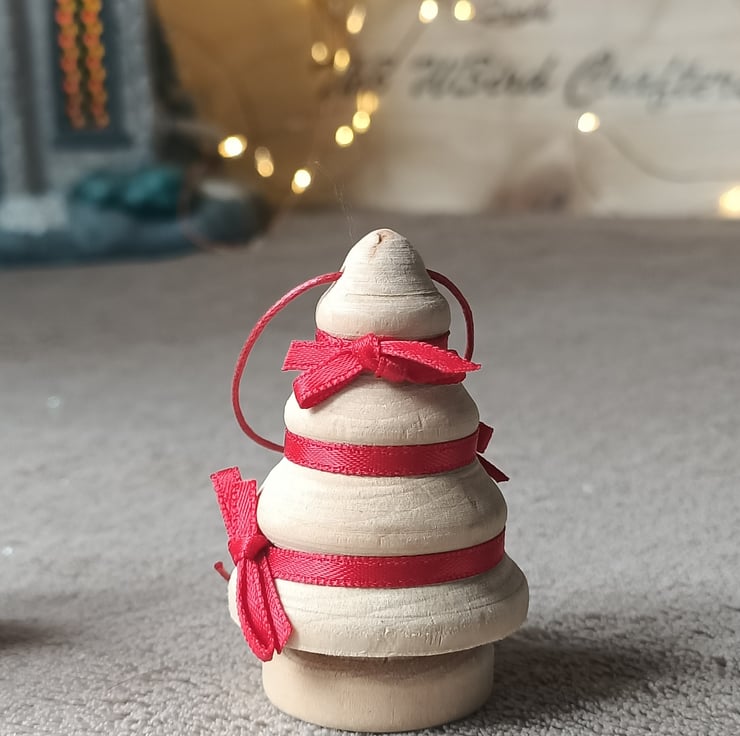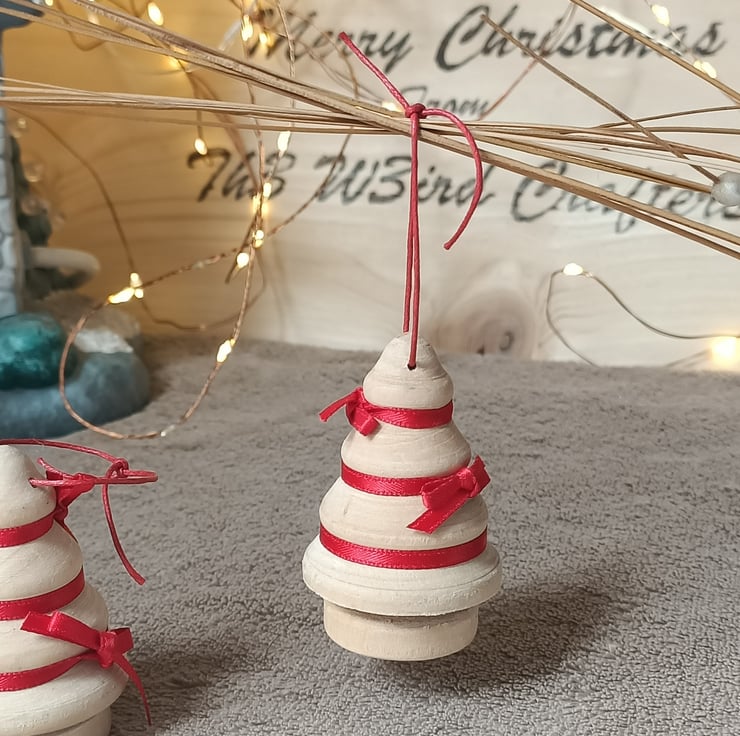wooden wood turned christmas tree hanging decoration red bow. One decoration supplied.