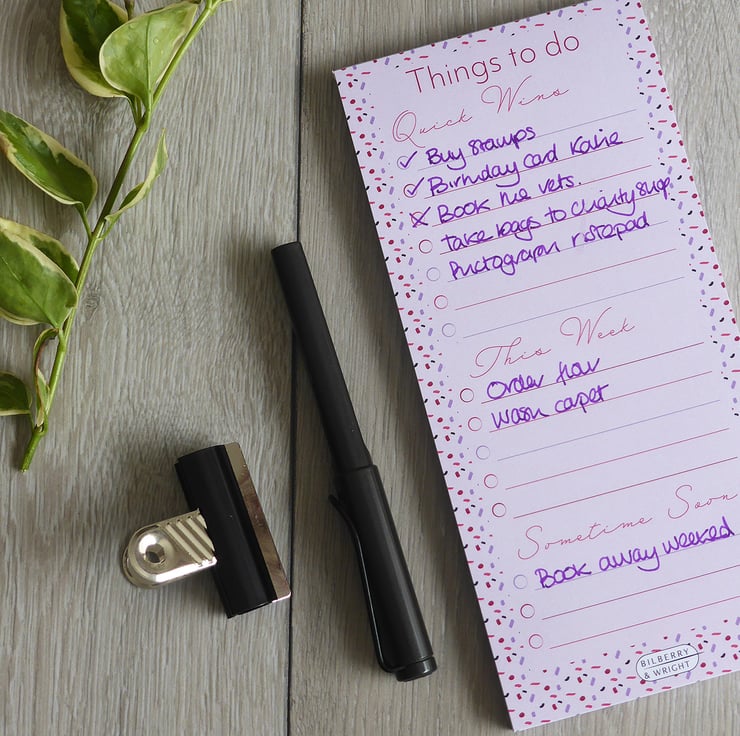 With a dotty pattern in a soft pink-purple colour, this stylish things to do notebook is perfect for your home office, kitchen worktop or coffee table. Practical and pretty, it helps you organise quick wins, weekly must-dos and longer-term plans all in one place.