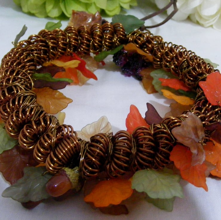 I've handmade this one of a kind, autumnal wreath by making the wreath base with antique bronze colour copper wire, which I've coiled. I've then wire wrapped