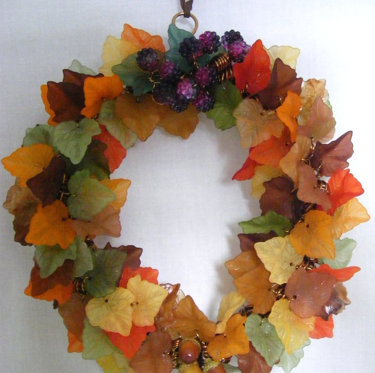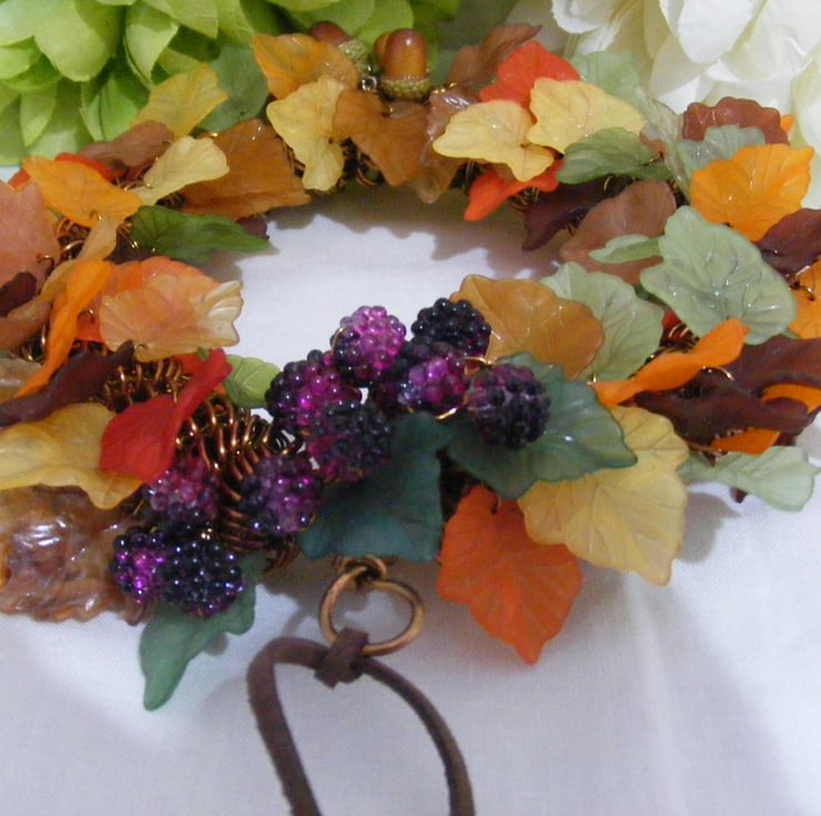 10 mm acrylic blackberry beads and 19 x 9 mm glass acorn beads to the wreath. I've attached some brown faux suede for hanging.