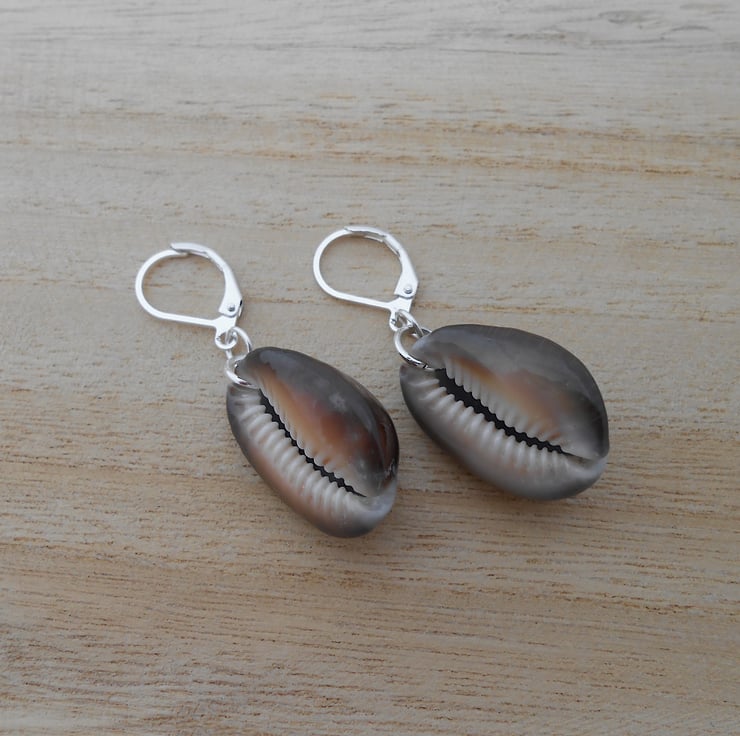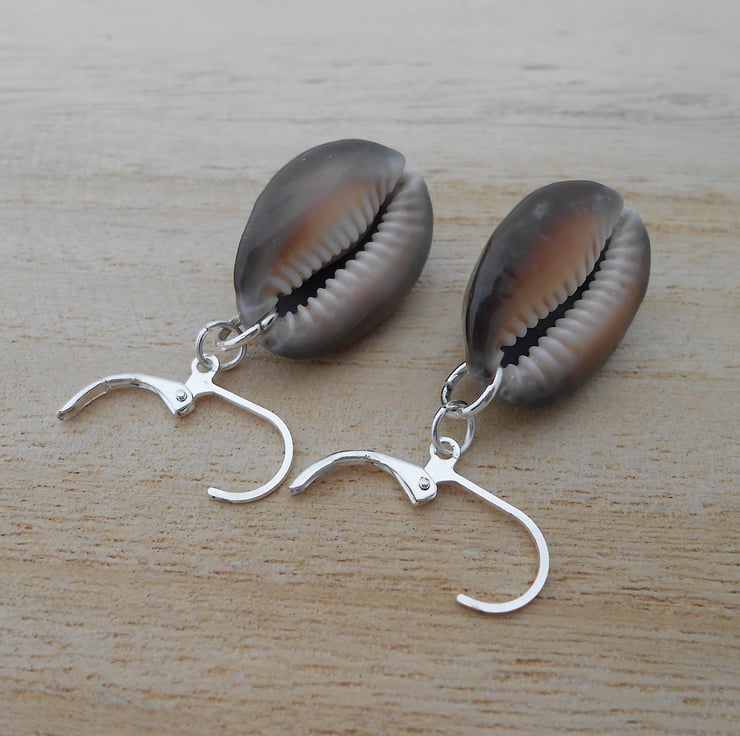 Real shell earrings in silver plate. These lovely snakehead cowrie shells are unique giving them a slightly mismatched look. They are attached to silver plated lever back ear wires so are lovely and secure in your ears. They are quite weighty (5 grams each) much more than my white cowrie shells (2 grams each).
