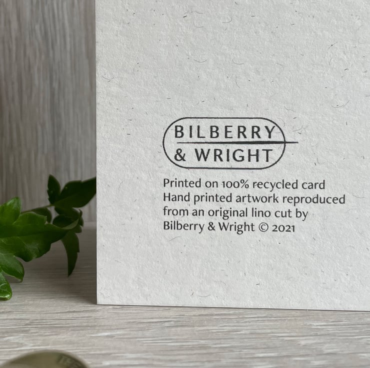 The original unique design is handprinted on to white 300gsm recycled card. As every card is carefully printed by hand, there may be some variation in the print of each card, which makes every item unique to you.