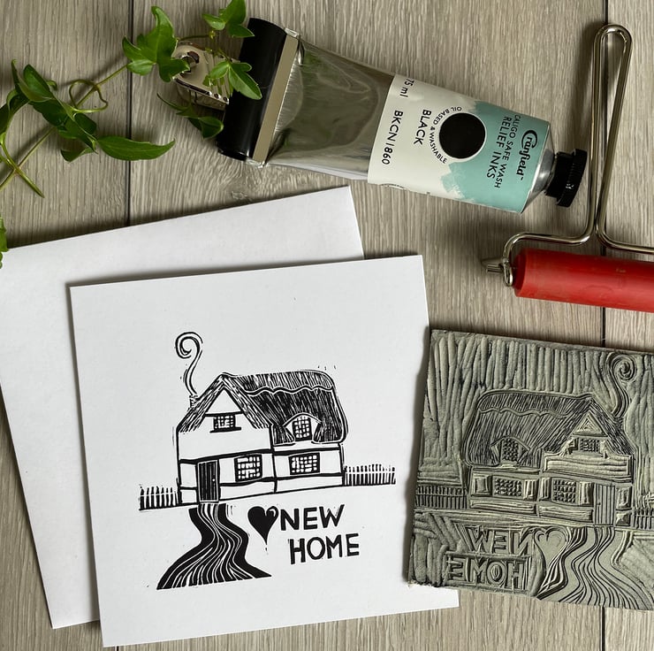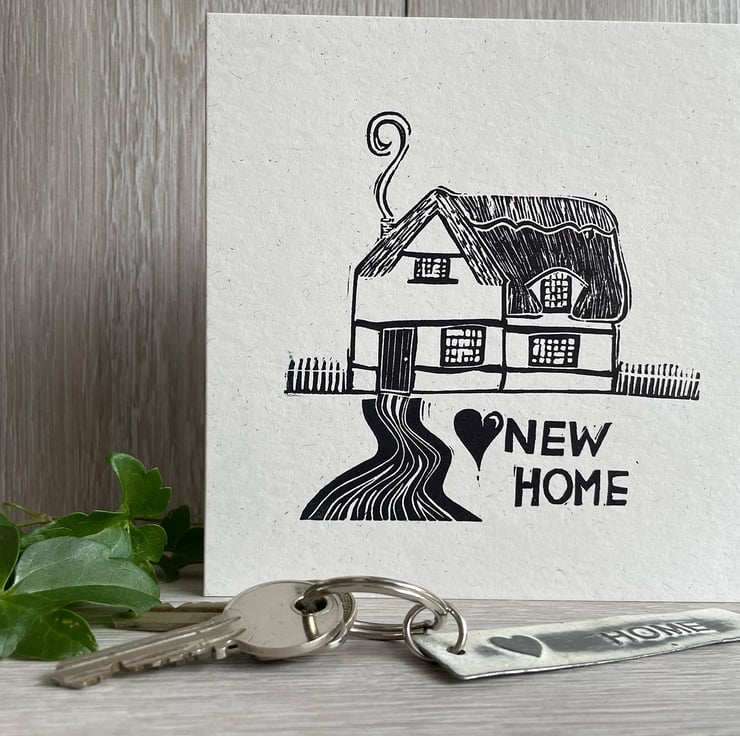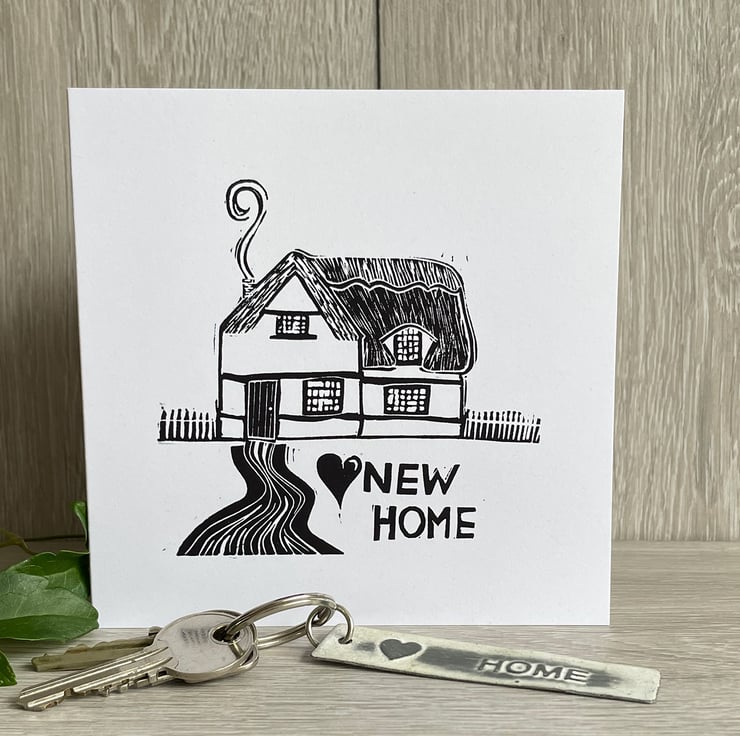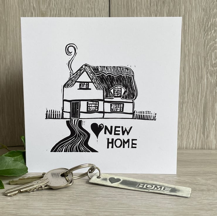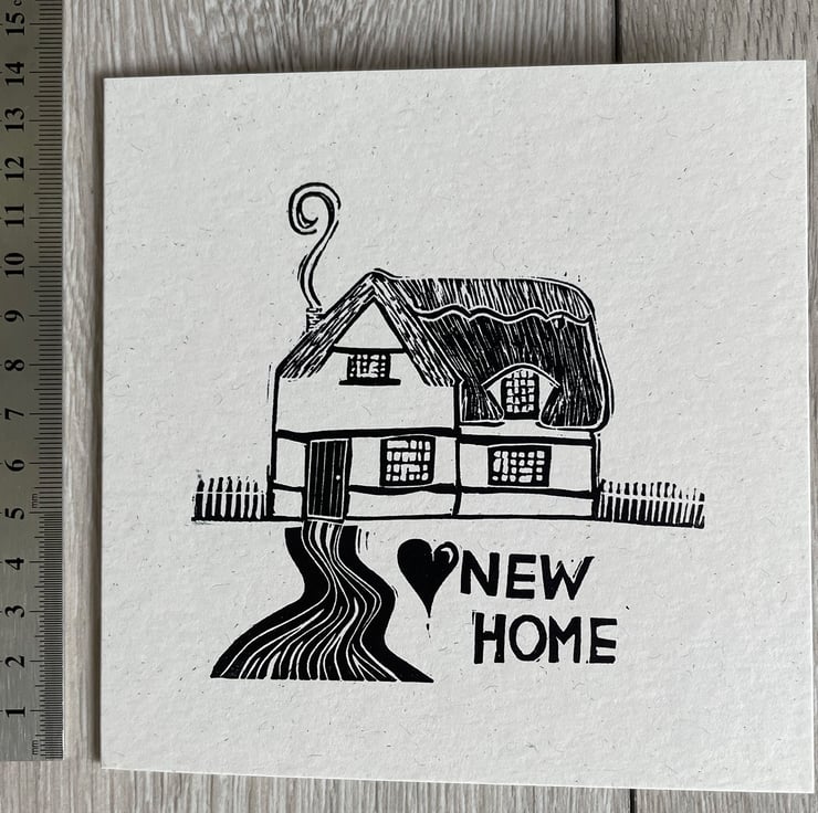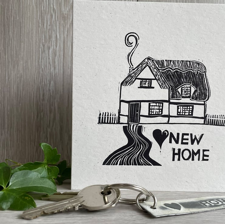 A 'New Home' handmade design greeting card, with linocut design printed on 300gsm card stock. The card is left blank inside for your own message, just right to send your best wishes for someone in their new home.