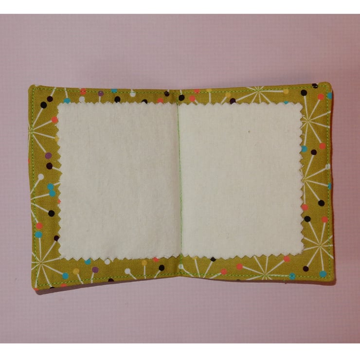 This needle case is made from a bright fabric featuring coloured headed pins, with a band of patchwork triangles in matching colours. It measures approx. 4.5 x 3.5 inches it is lined in the same cotton fabric, and has four flannel leaves for your pins and needles.