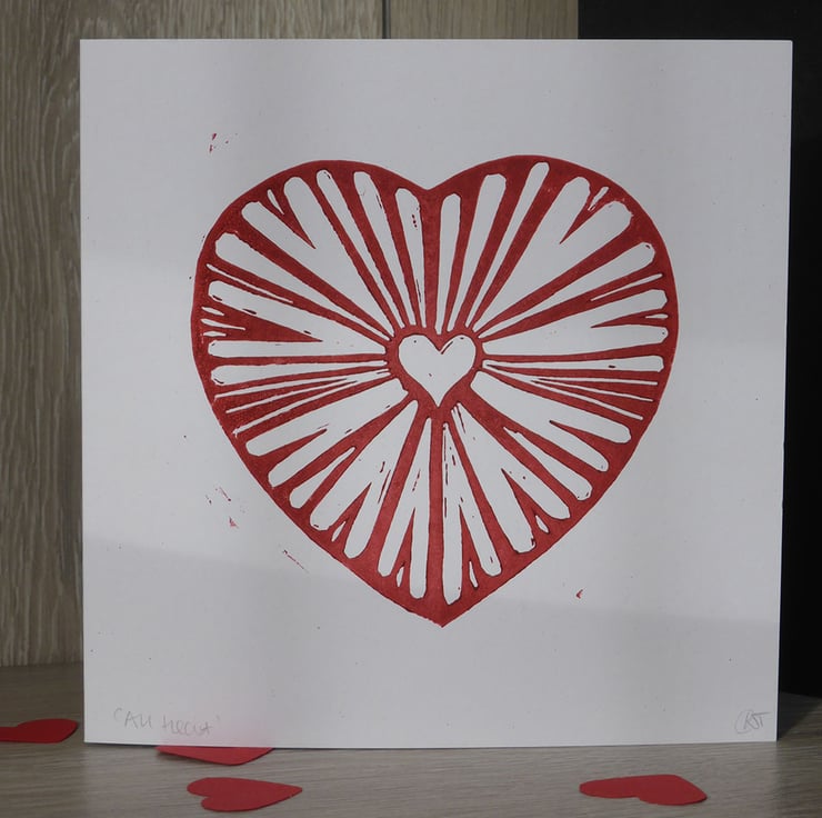 An 'All Heart' handmade greeting card, with red linocut design printed on 300gsm card stock. The card is left blank inside for your own message, an ideal Valentines or anniversary card.
