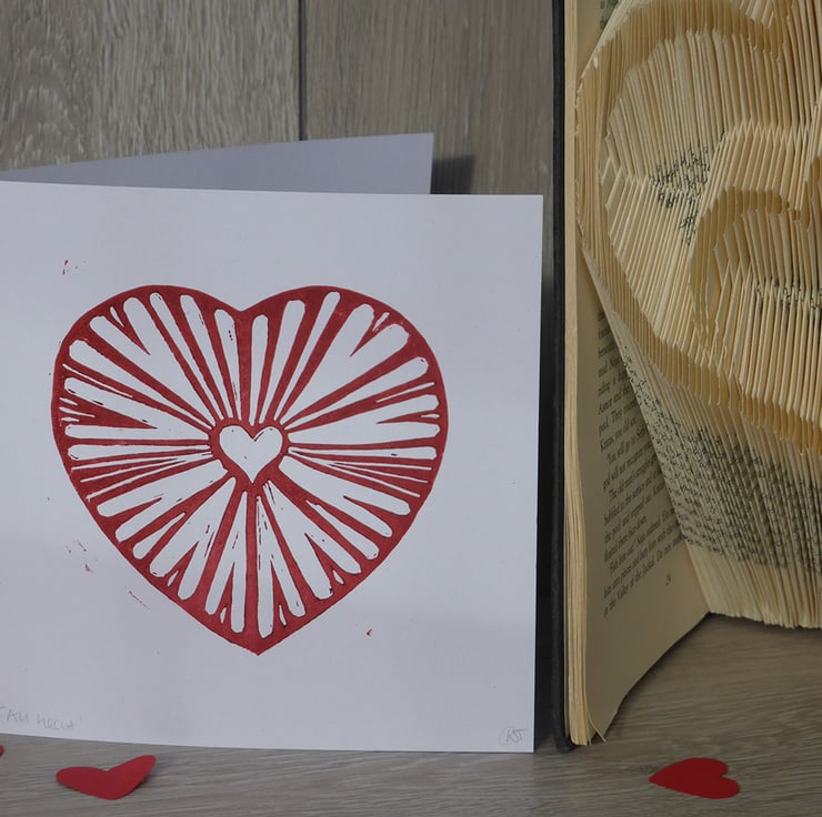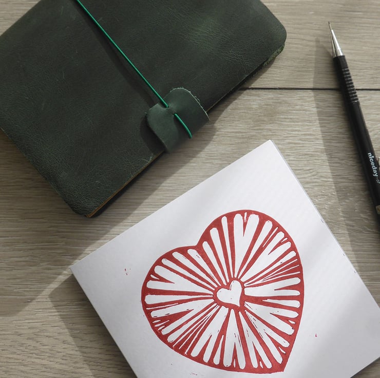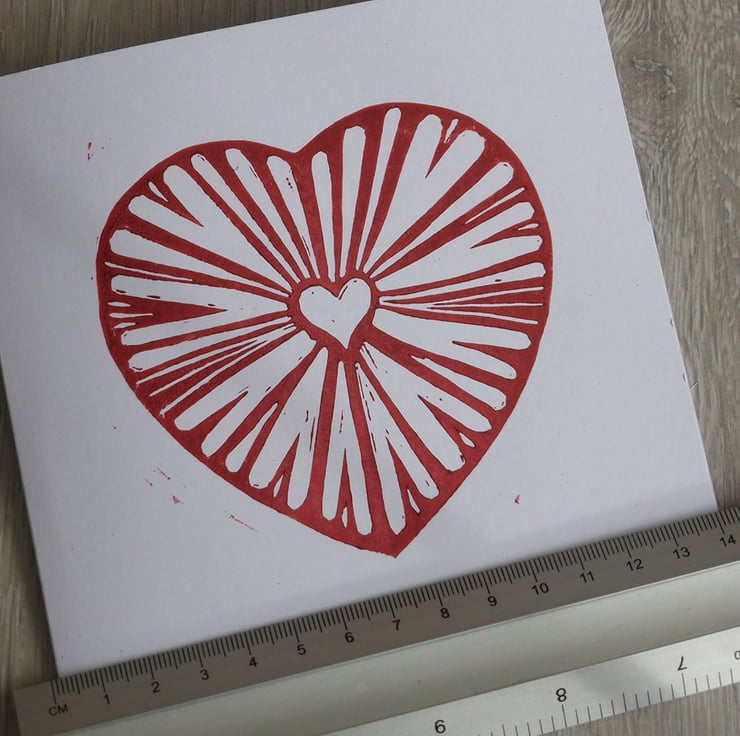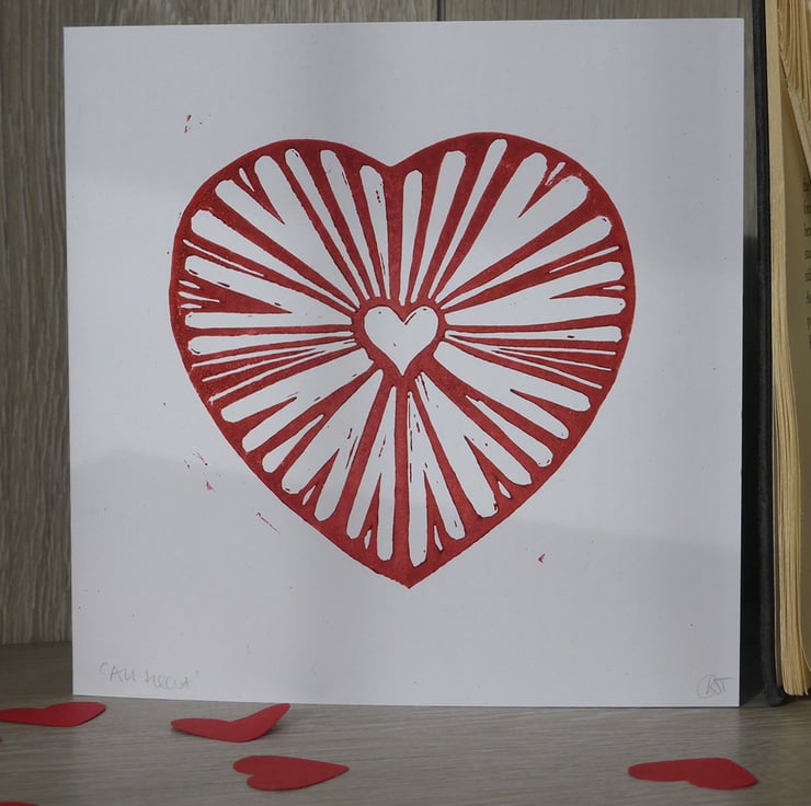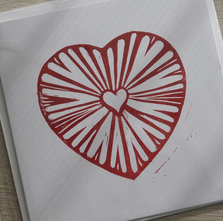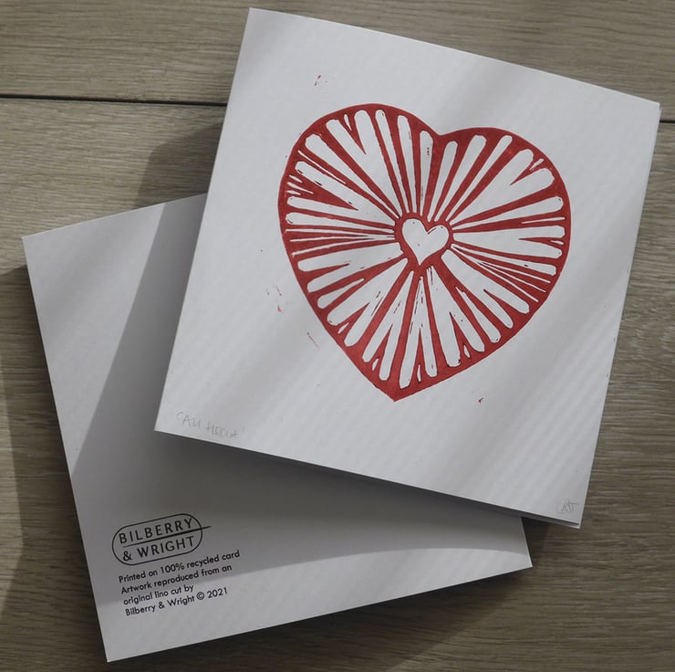 The original unique red heart design is handprinted on to white 300gsm recycled card. As every card is carefully printed by hand, there may be some variation in the print of each card, which makes every item unique to you.