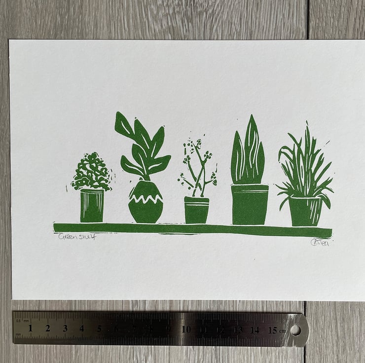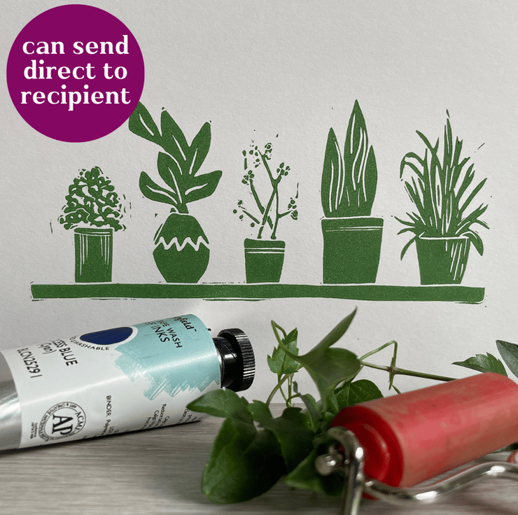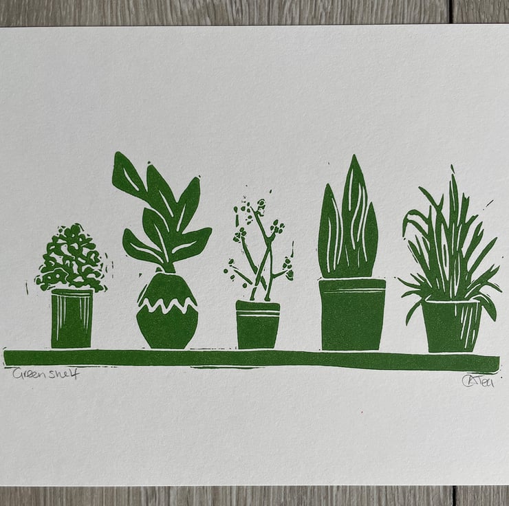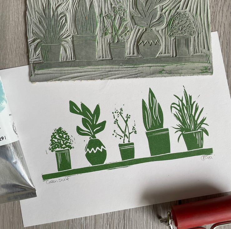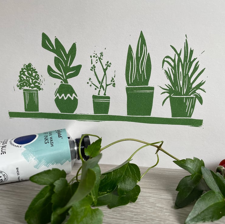 An original hand cut and handprinted linocut print of Houseplants lined up on a shelf.
