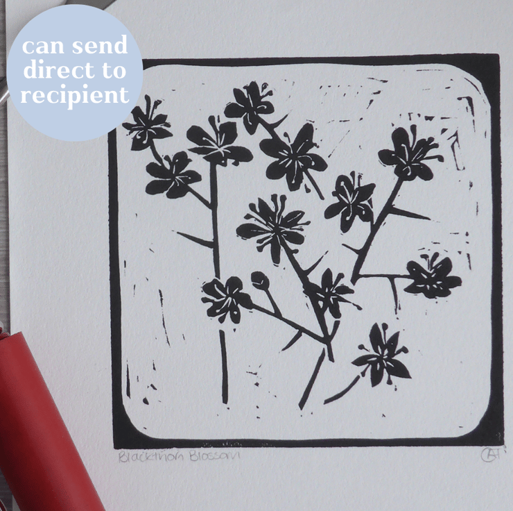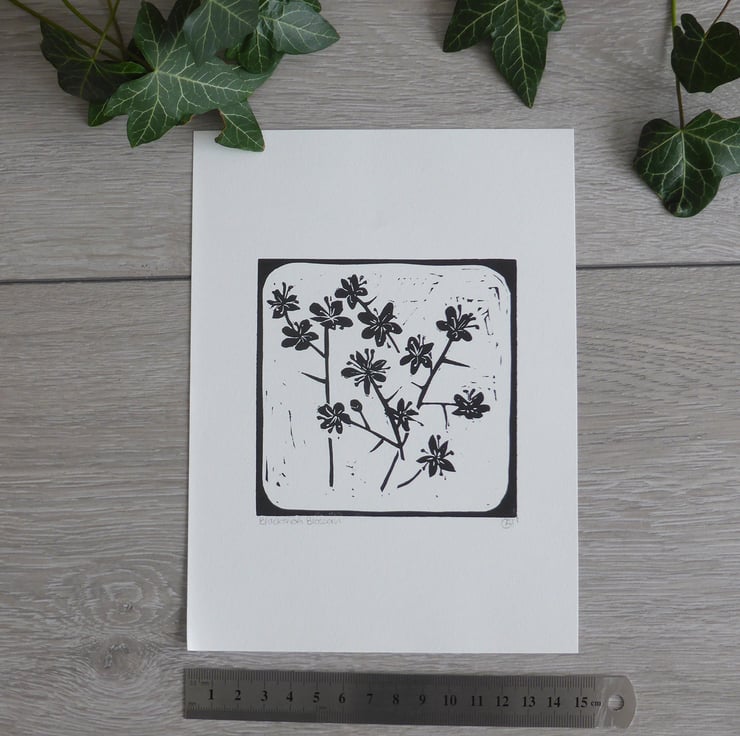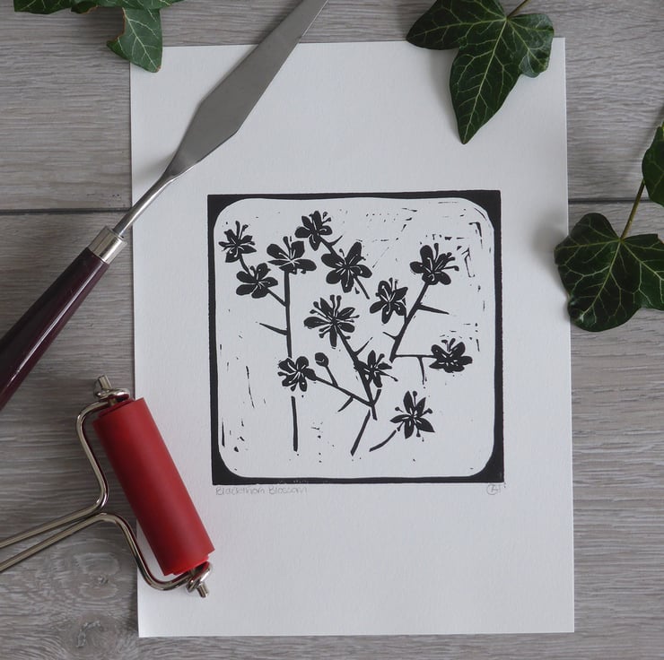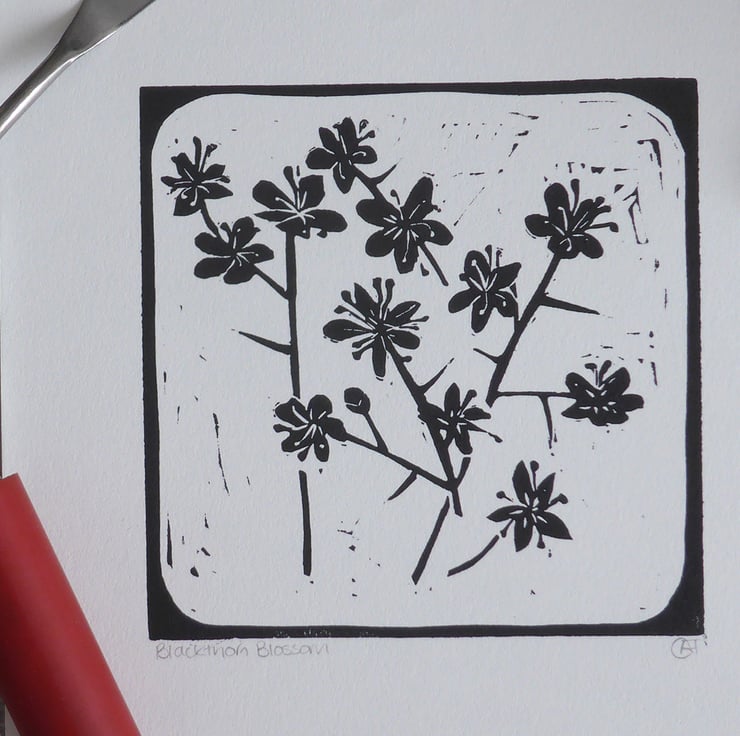 An original hand cut and handprinted linocut print of Spring Blackthorn Blossom.