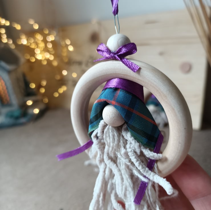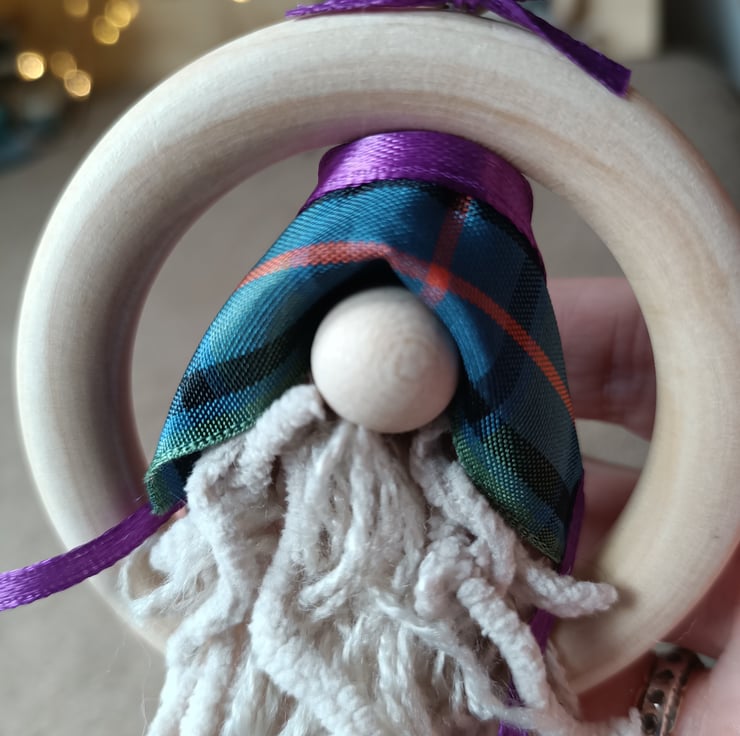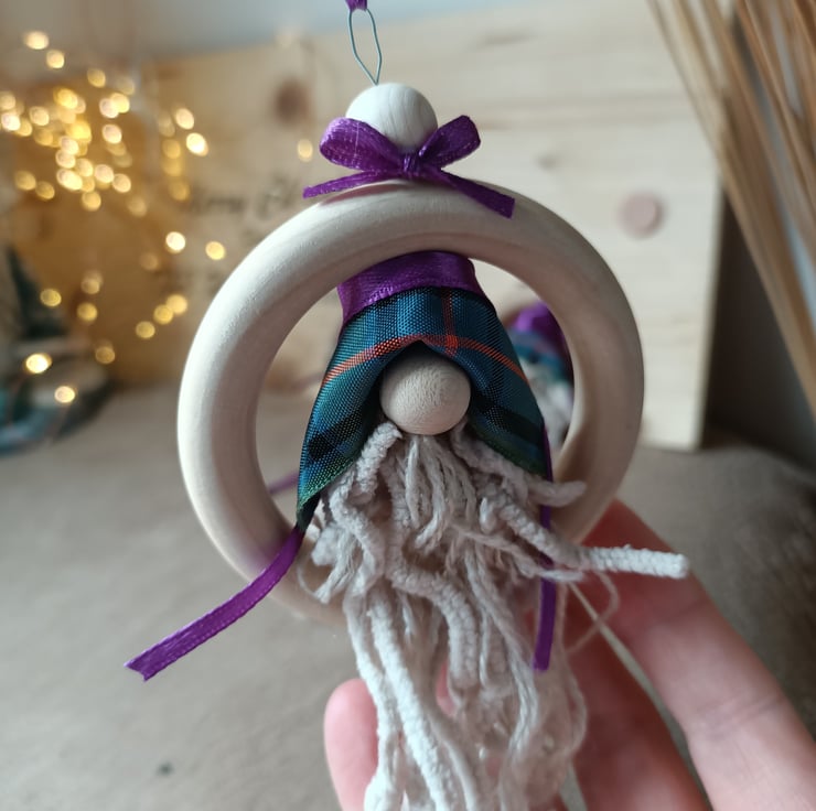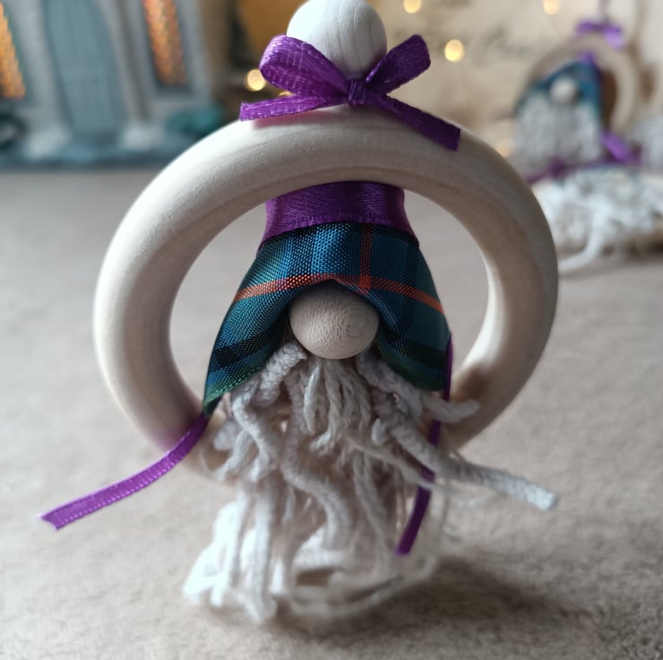 Purple and blue tartan wild christmas gnome christmas decoration wooden bauble.