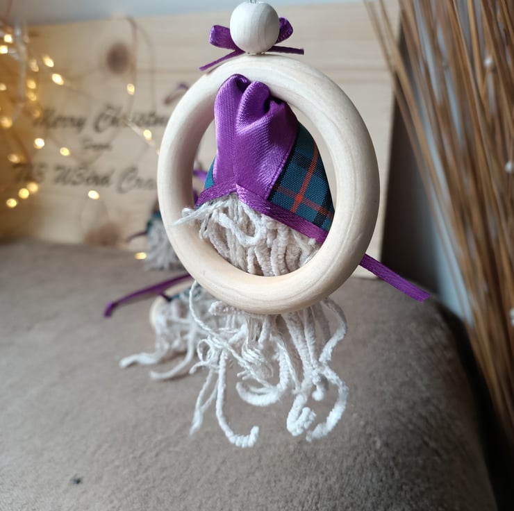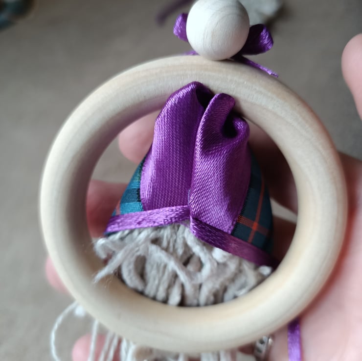 We made him using our wooden hoops, his hat is purple satin with a blue tartan trim.