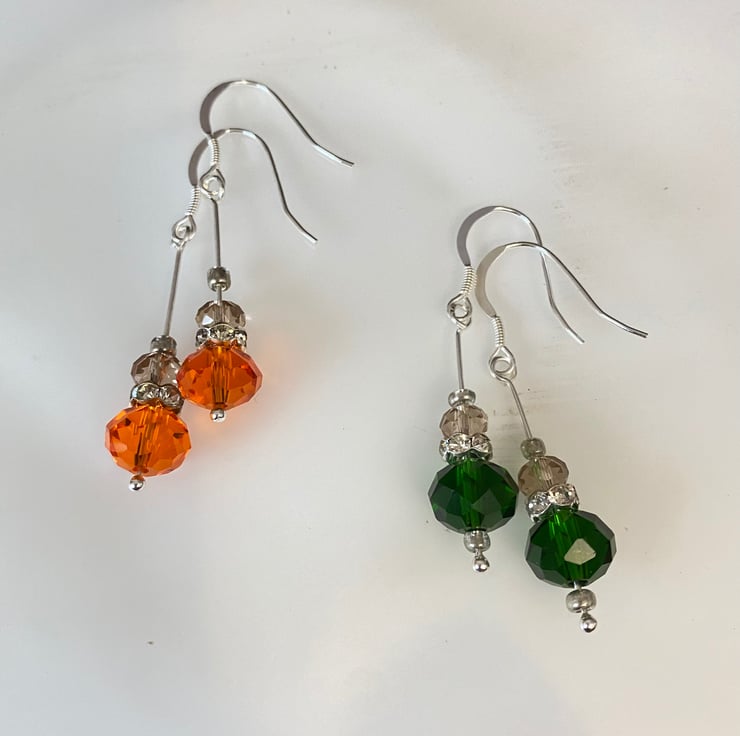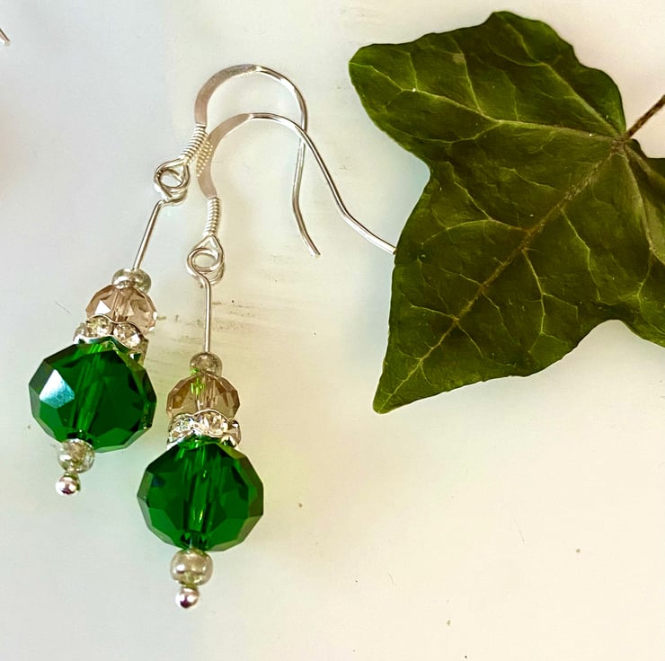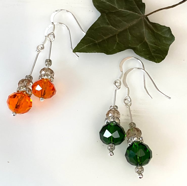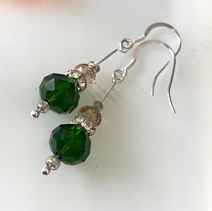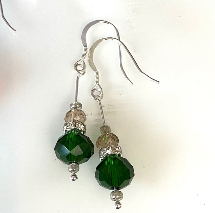 Green Autumn coloured glass and gold coloured Crystal Earrings silver hook Earings. .