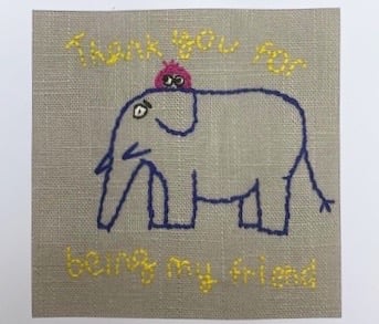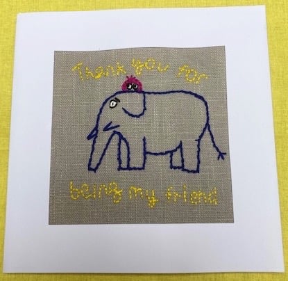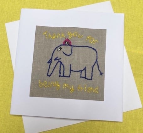 This tiny bogle creature has forged a friendship with his magnificent elephant friend. A friend who carries him when he is in need. The two friends have been hand embroidered on to natural linen and mounted in a white aperture greetings card. The card is 144mm x 144mm and has been left blank inside. This card would be a lovely card to send to your dearest friend.