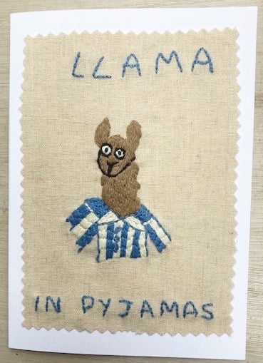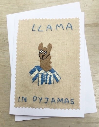 This adorable llama is ready for bed in his jaunty blue and white striped pyjamas. He has been hand embroidered onto natural linen and mounted on a greeting card (4" x 6"). The card has been left blank for your own message. The card could also be framed as a little picture by the recipient.