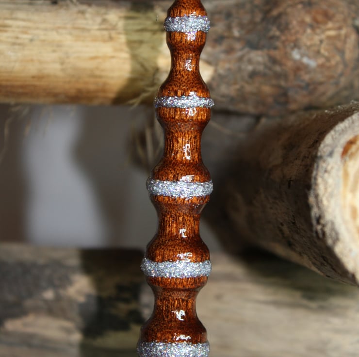 A piece of recycled wood was cleaned and sanded to enable me to upcycle it. The decoration was then shaped on a wood turning lathe before being further sanded to provide it with a smooth to the touch feel. Glue and glitter was added before being coated with lacquer to enhance the grain and protect the wood. The lacquer is heat and water resistant.