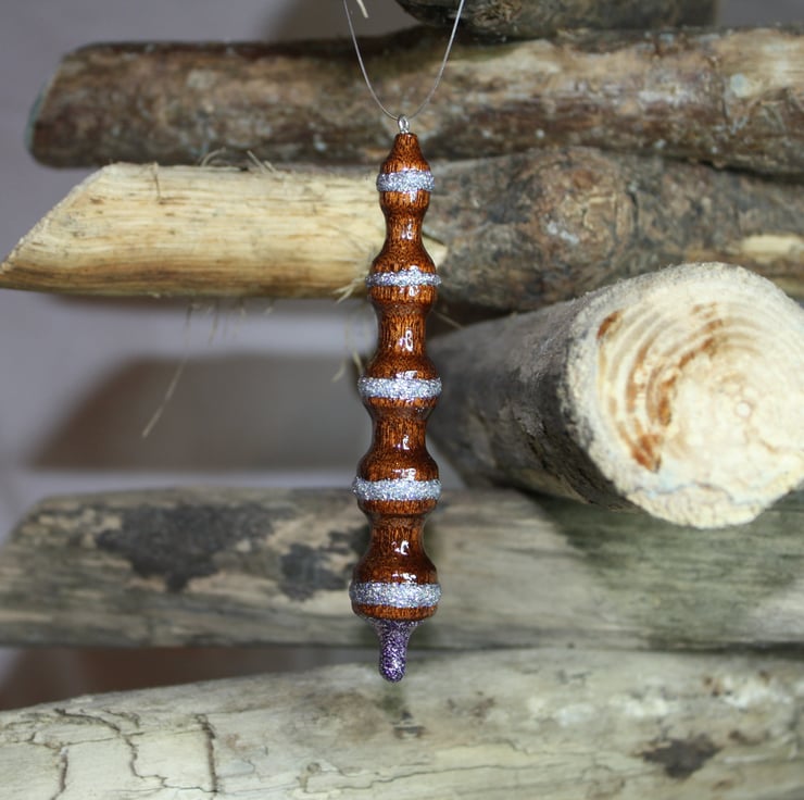 This unique wooden Christmas Bauble with silver and purple glitter, has been upcycled from reclaimed wood. It has been woodturned from Sapele wood, which is often known as African Mahogany. This beautiful Christmas decoration will make a lovely addition to your Christmas tree. It would make a perfect gift for numerous occasions such as a sister's gift, a housewarming gift or a Christmas present.