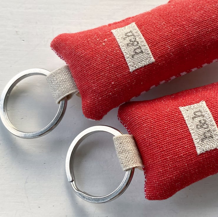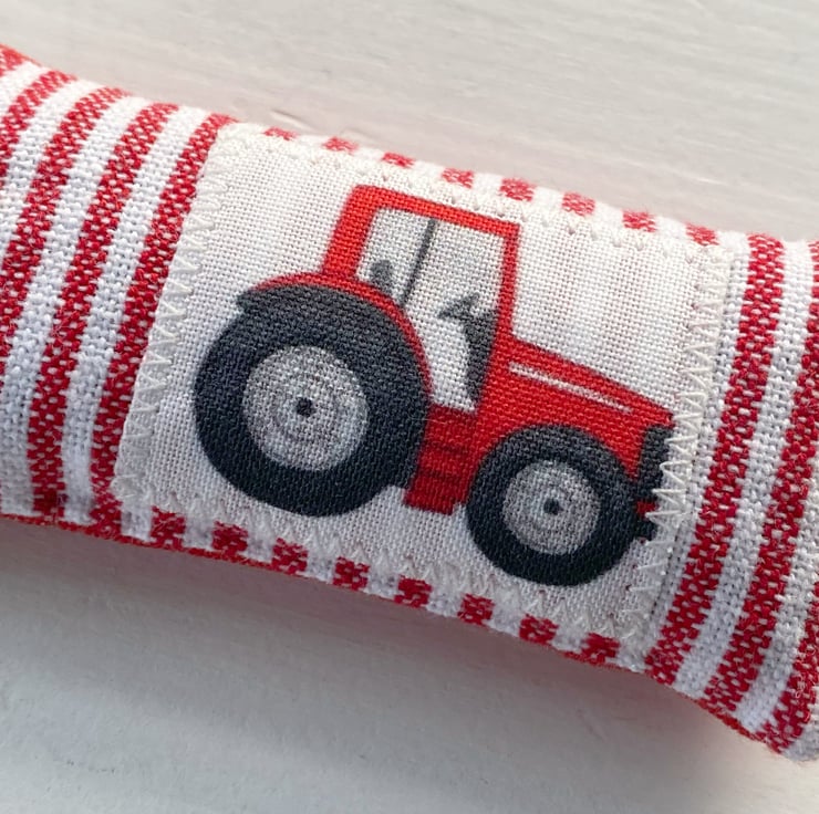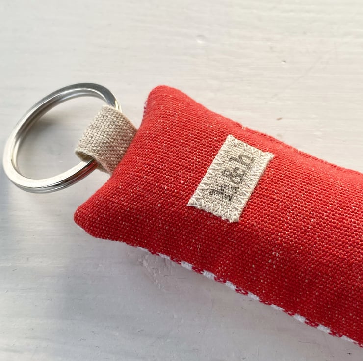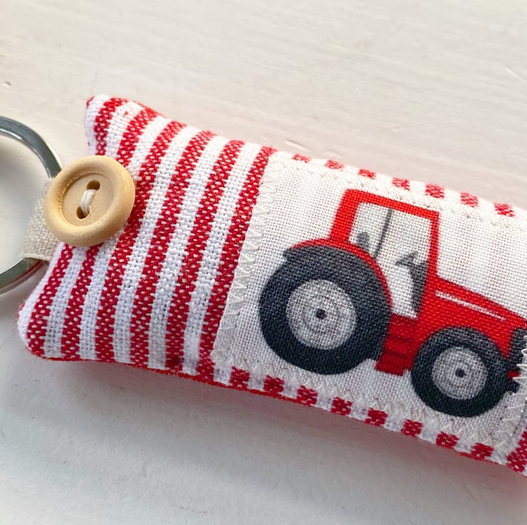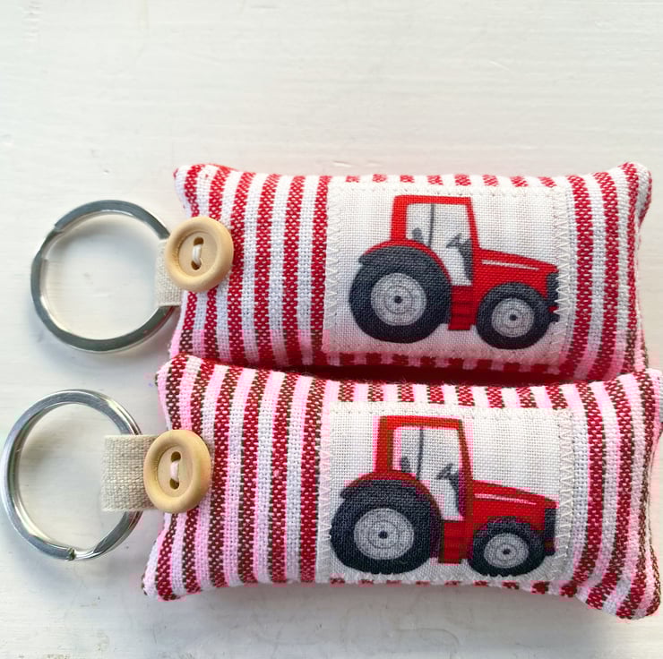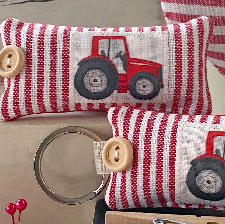 A fabulous red tractor and fantastic red and white woven cotton stripes too. Handmade in my garden studio, the key ring is generously filled with super fragrant locally grown lavender and is finished off with a rustic wooden button. The stainless steel split ring is securely attached with a linen tape loop.