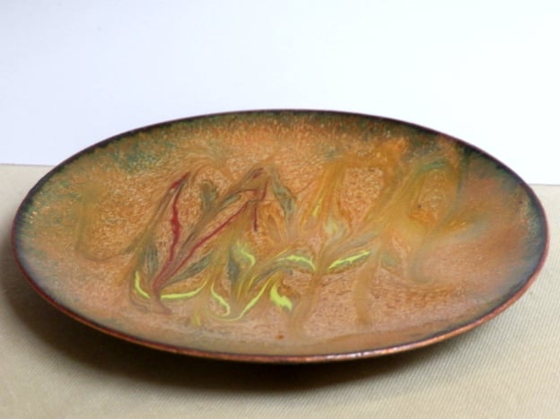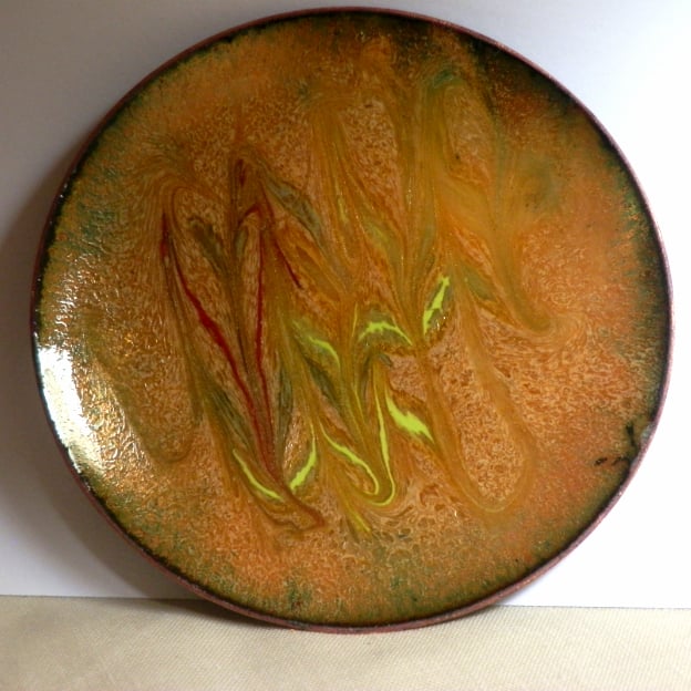 The burnt orange background of this dish is laid over several layers of clear enamel. Consequently the brown of the copper base may show through in tones varying from dull brown to bright gold depending on the intensity and direction of the light that strikes it.