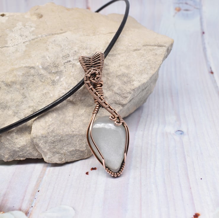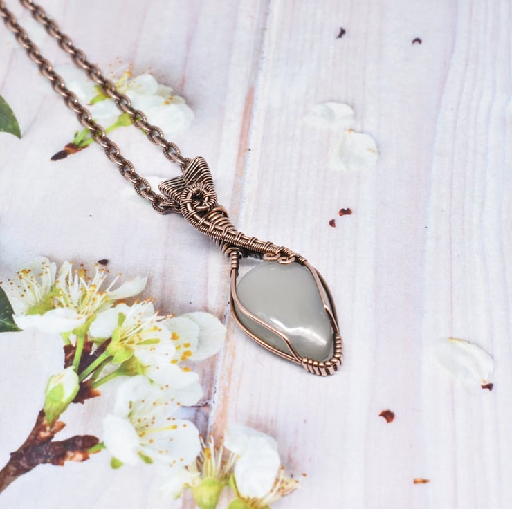 This dainty pendant measures approximately 15 mm (5/8 inch) by 50 mm (2 inches) and is handmade using solid copper wire wrapped and woven around this pretty grey moonstone.