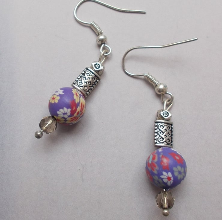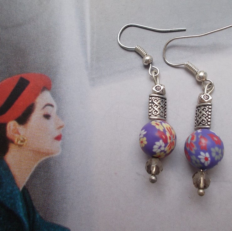 Pretty purple polymer clay beads with Tibetan silver beads and glass beads on sterling silver nickel free hooks. Handmade with love and with free UK postage.
