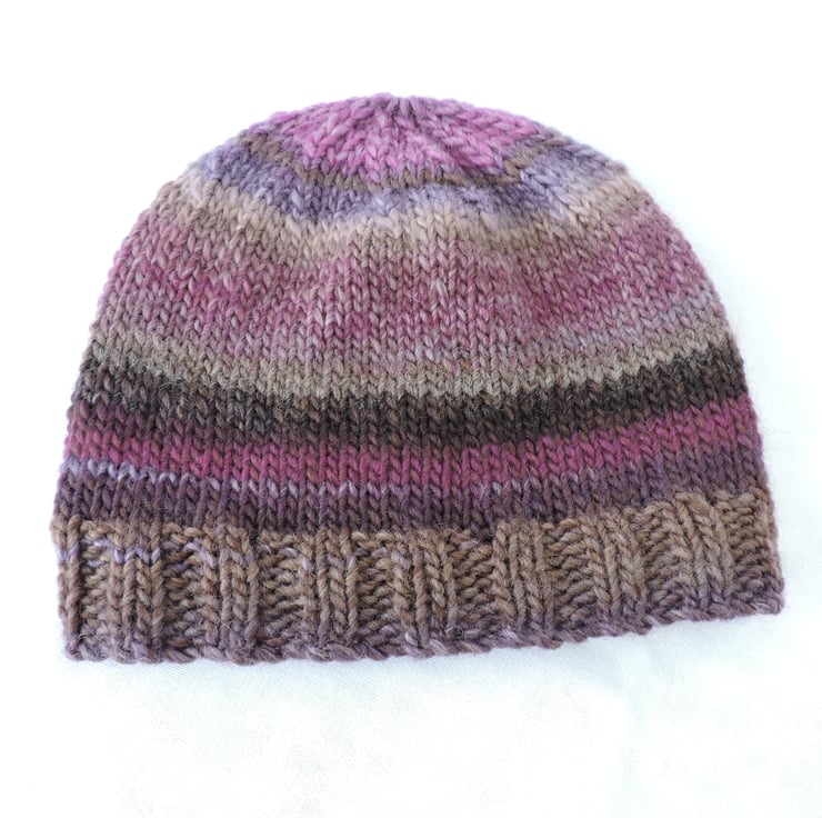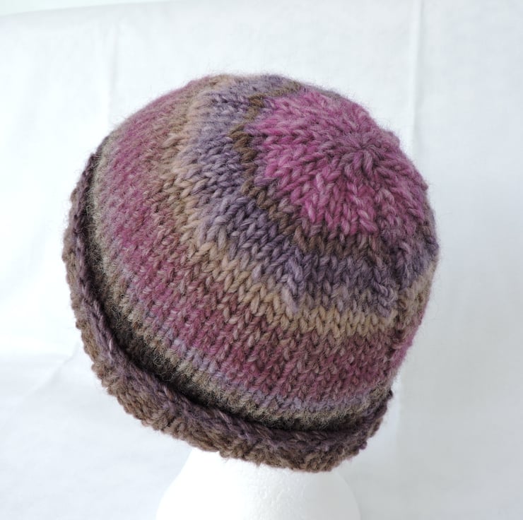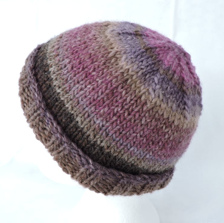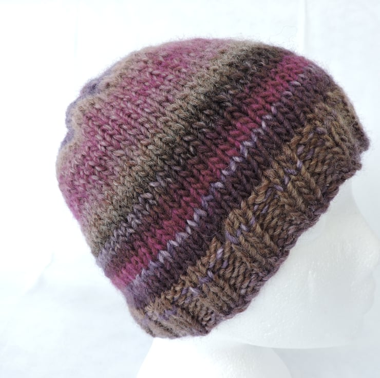 This adults beanie hat has been knitted with a lovely chunky self striping wool and acrylic yarn. Lovely moorland colours of purple, lilac, oatmeal, taupe and raspberry pink. It has a ribbed brim and a stocking stitch body. Soft and warm making it a perfect winter warmer to keep you snug in the cold weather.