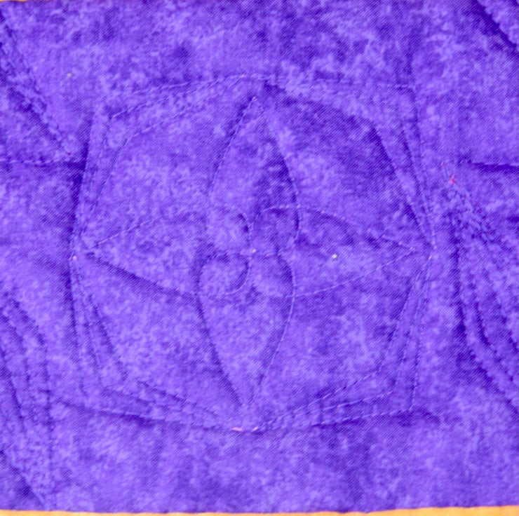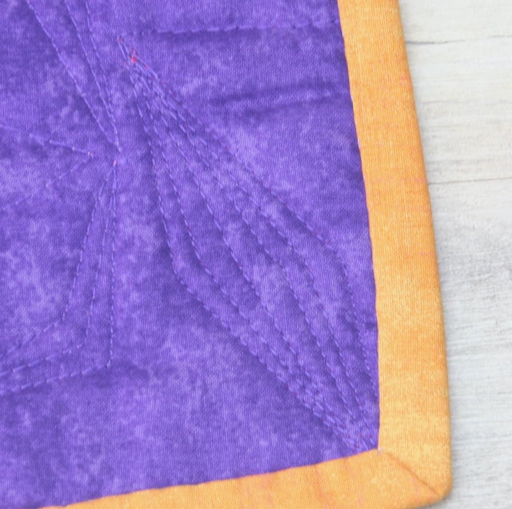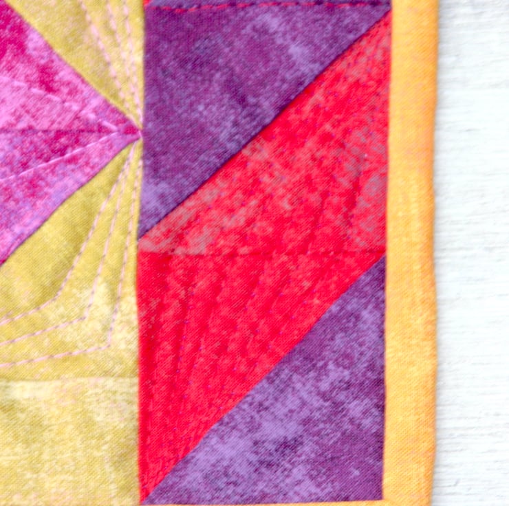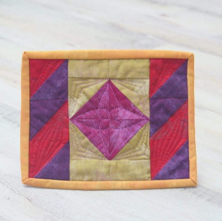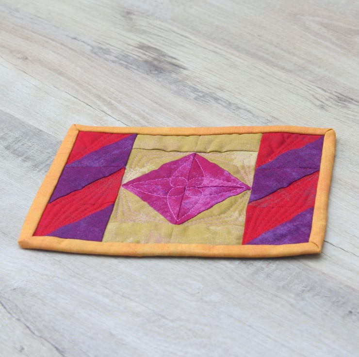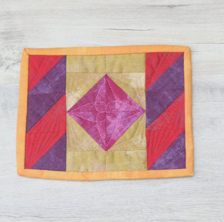 The front is has a traditional square in a square patchwork design, with diagonal features along each side. It features striking red, yellow, pink and purple plain fabrics. The back is a plain deep purple cotton, with a middle layer of eco-friendly polyester wadding. A deep yellow binding is used to bring the colours together. The quilting of the three layers is used to give detail and depth to the patchwork.