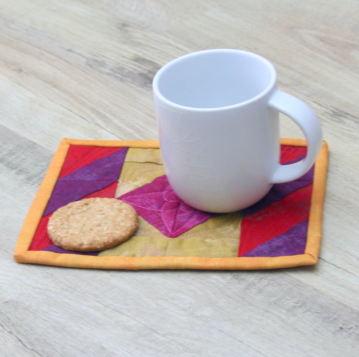 This bright and colourful mug rug, in a traditional patchwork design, is big enough to accommodate your drink and a cheeky biscuit.