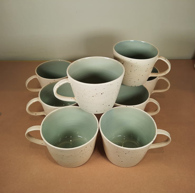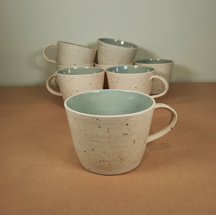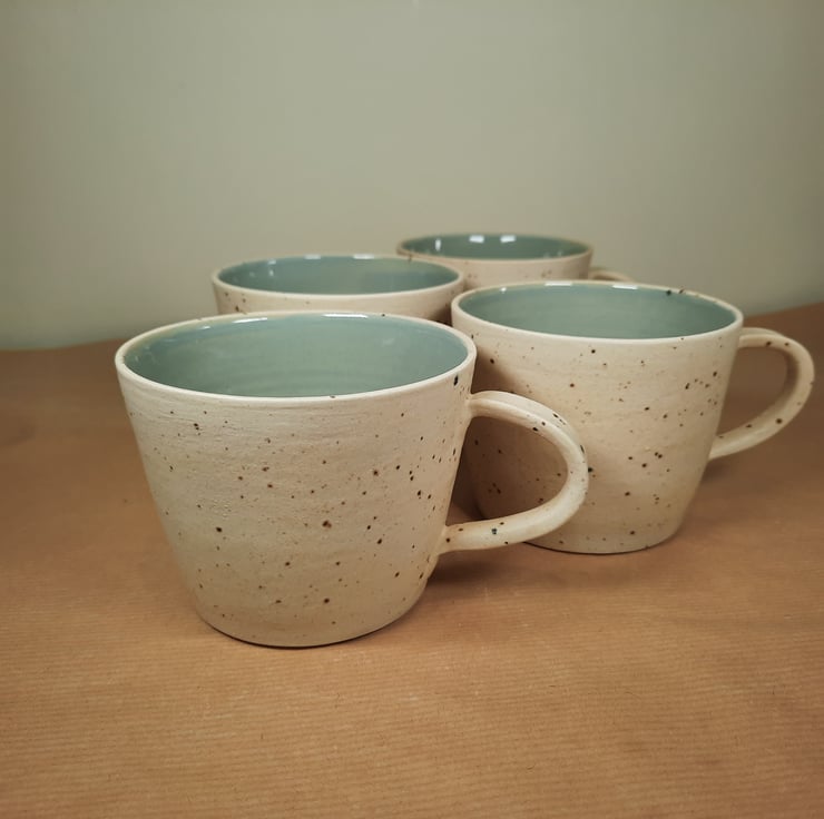 Hand thrown on the wheel, the mugs have a glossy pale turquoise green interior and a matt cream speckle exterior. They are made from with high fired stoneware which is robust and hard wearing and ready for daily use and also can go in the dishwasher.