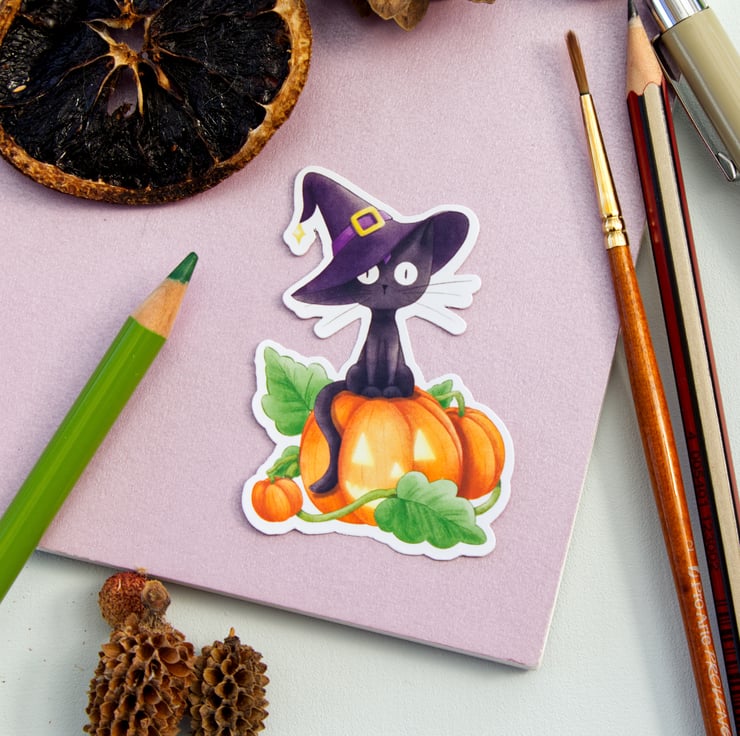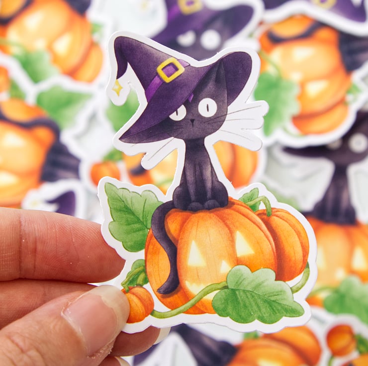 An adorable matte vinyl sticker of a witchy black cat sitting on pumpkins. The perfect little gift for a Halloween lover, or just a cute sticker to add to your books, planner or to decorate your laptop.